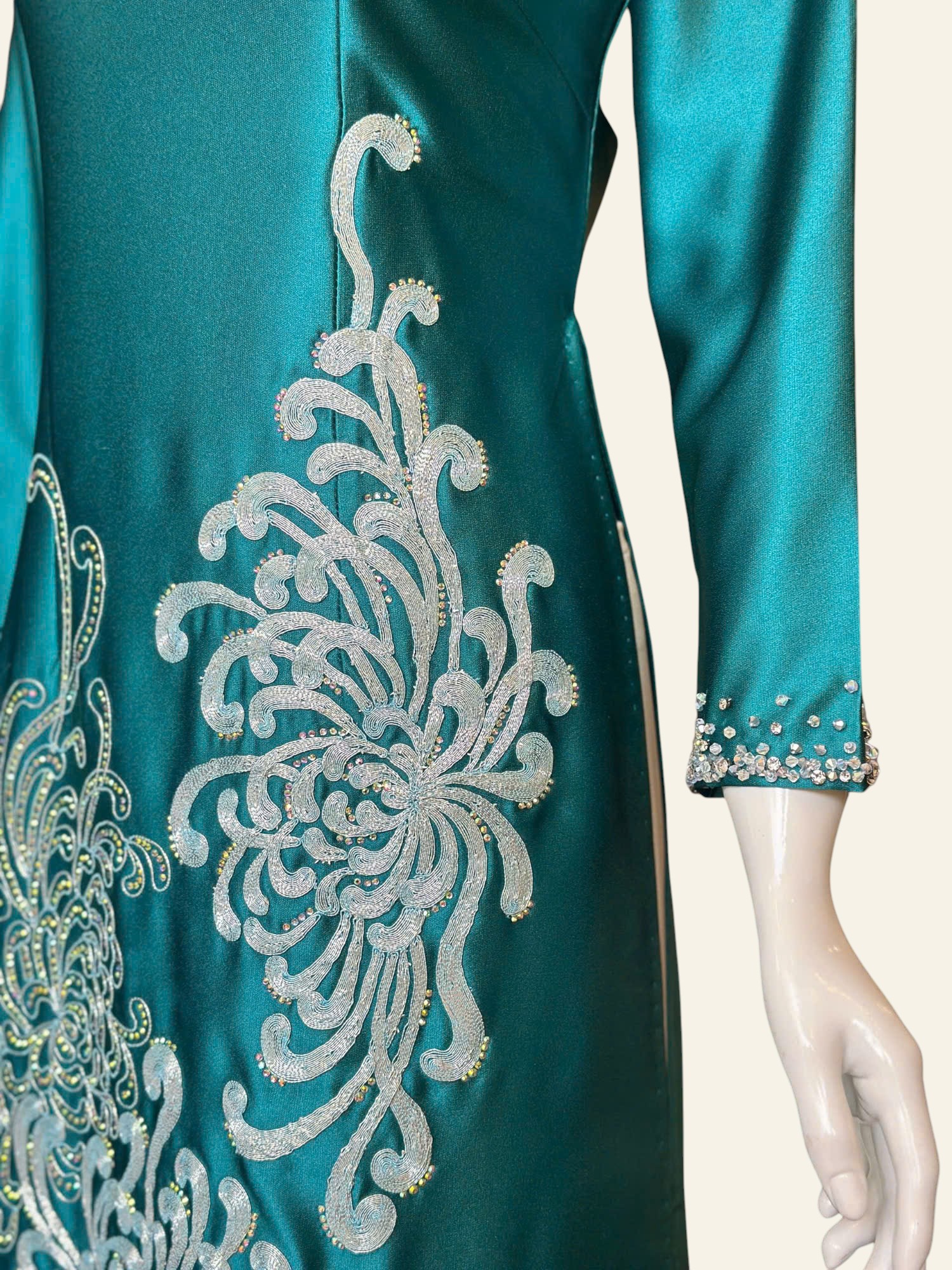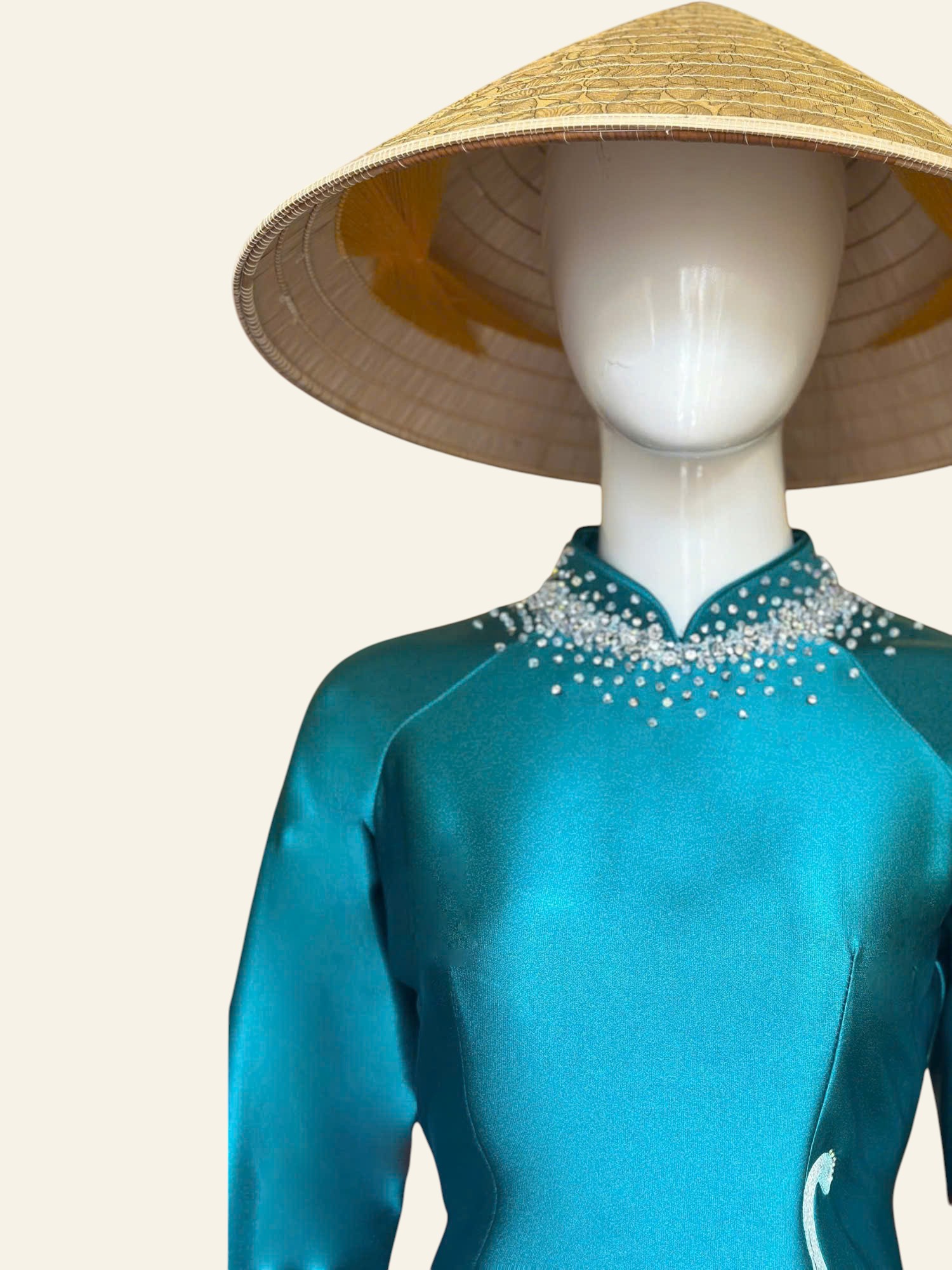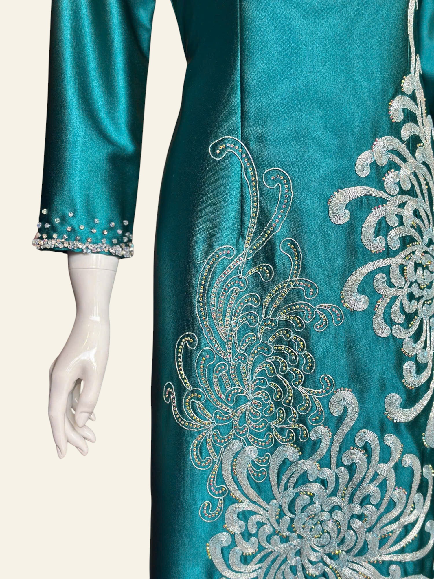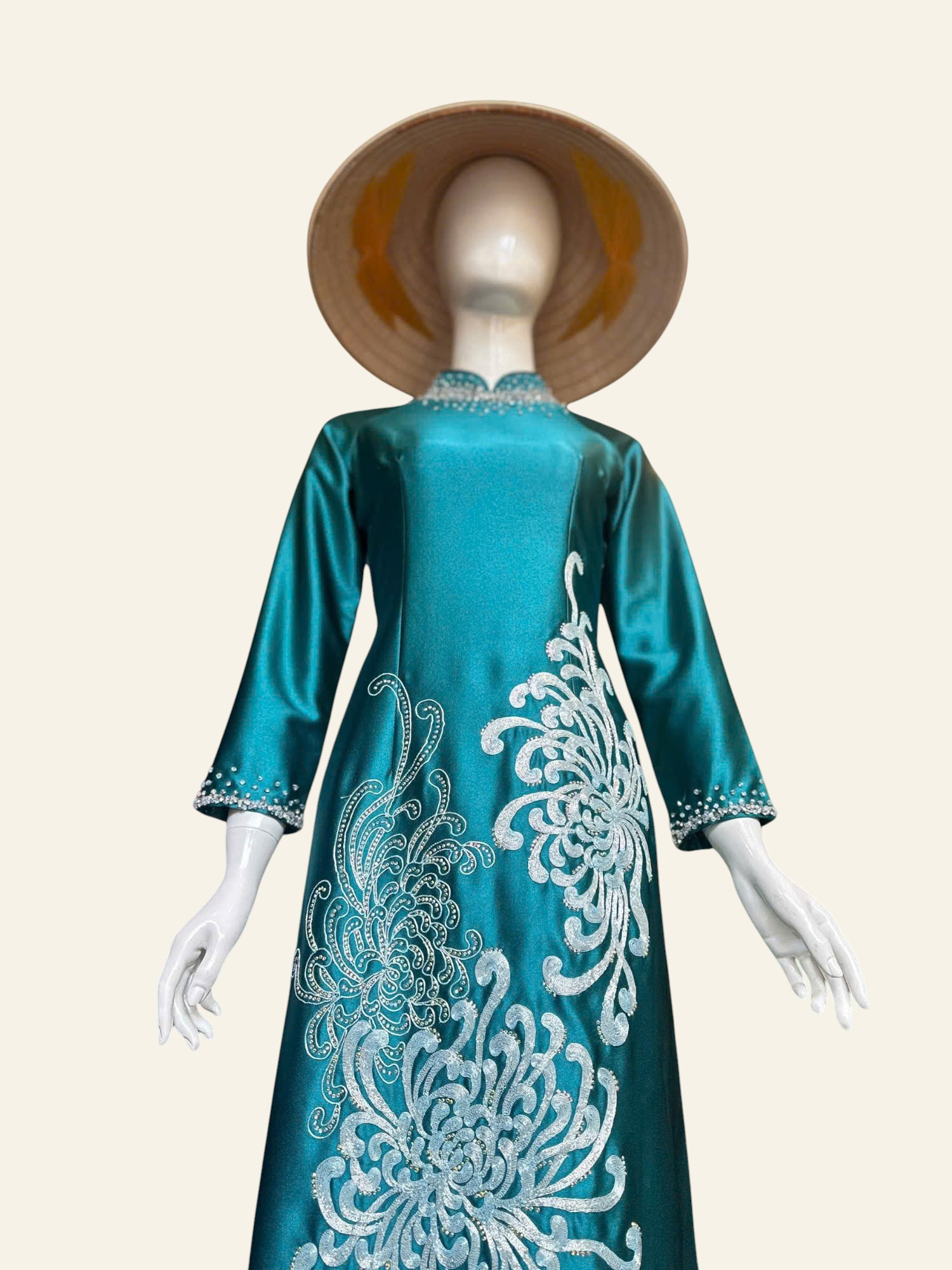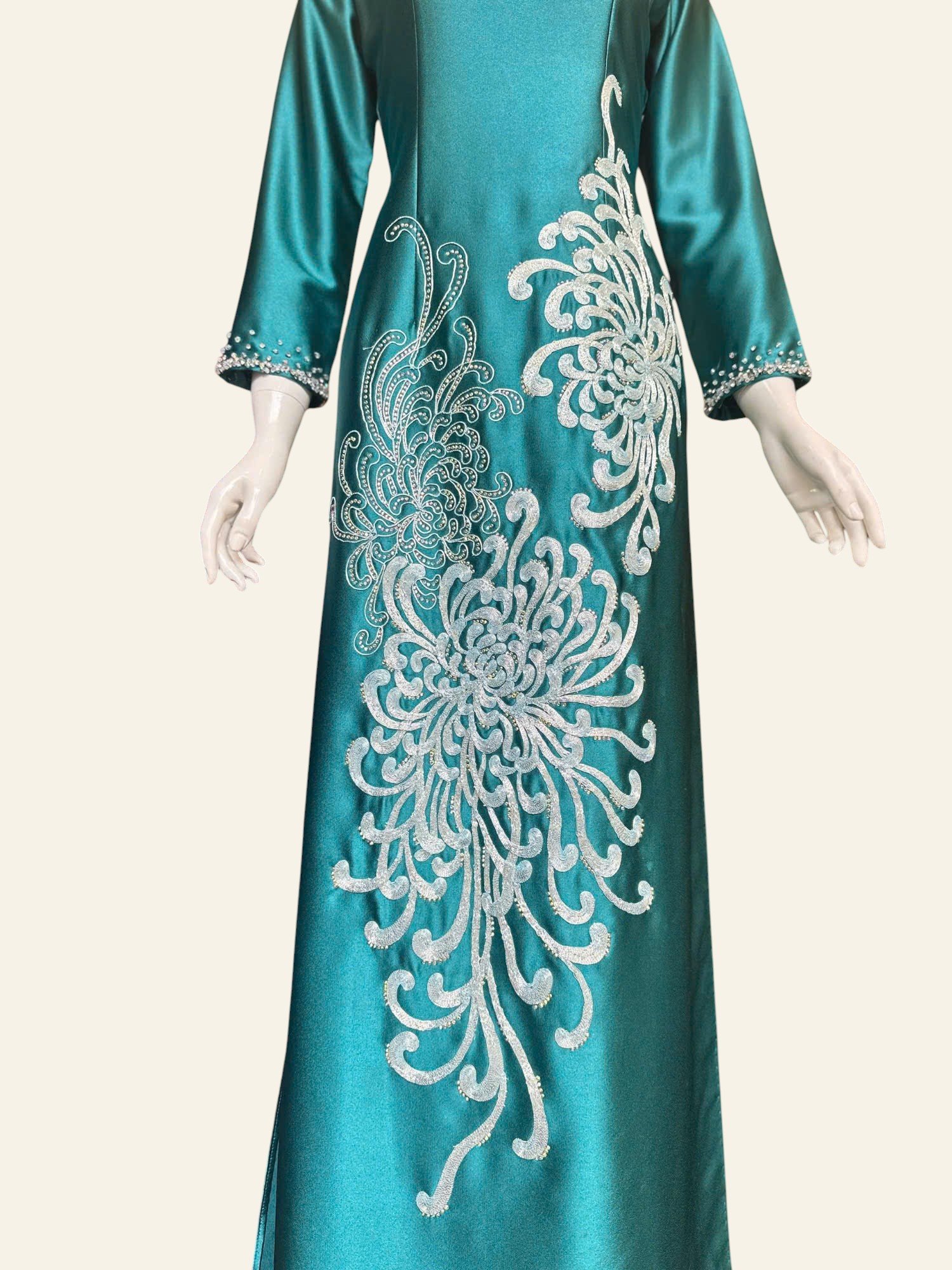 Cúc mẫu đơn mang trong mình vẻ đẹp tròn đầy, ung dung và đĩnh đạc. Không rực rỡ phô trương, từng lớp cánh xếp chồng lên nhau một cách hài hòa, gợi cảm giác viên mãn và bền lâu. Trong mỹ học Á Đông, cúc mẫu đơn là biểu tượng của phú quý, thịnh vượng nhưng vẫn giữ được sự nền nã, tinh tế. Loài hoa ấy đại diện cho khí chất của người phụ nữ trưởng thành – sâu sắc, điềm tĩnh và biết giá trị của chính mình. Khi hiện diện trên tà áo dài, cúc mẫu đơn không chỉ là họa tiết trang trí, mà còn là lời chúc an lành, đủ đầy và sang trọng, lặng lẽ tỏa hương theo từng bước đi.