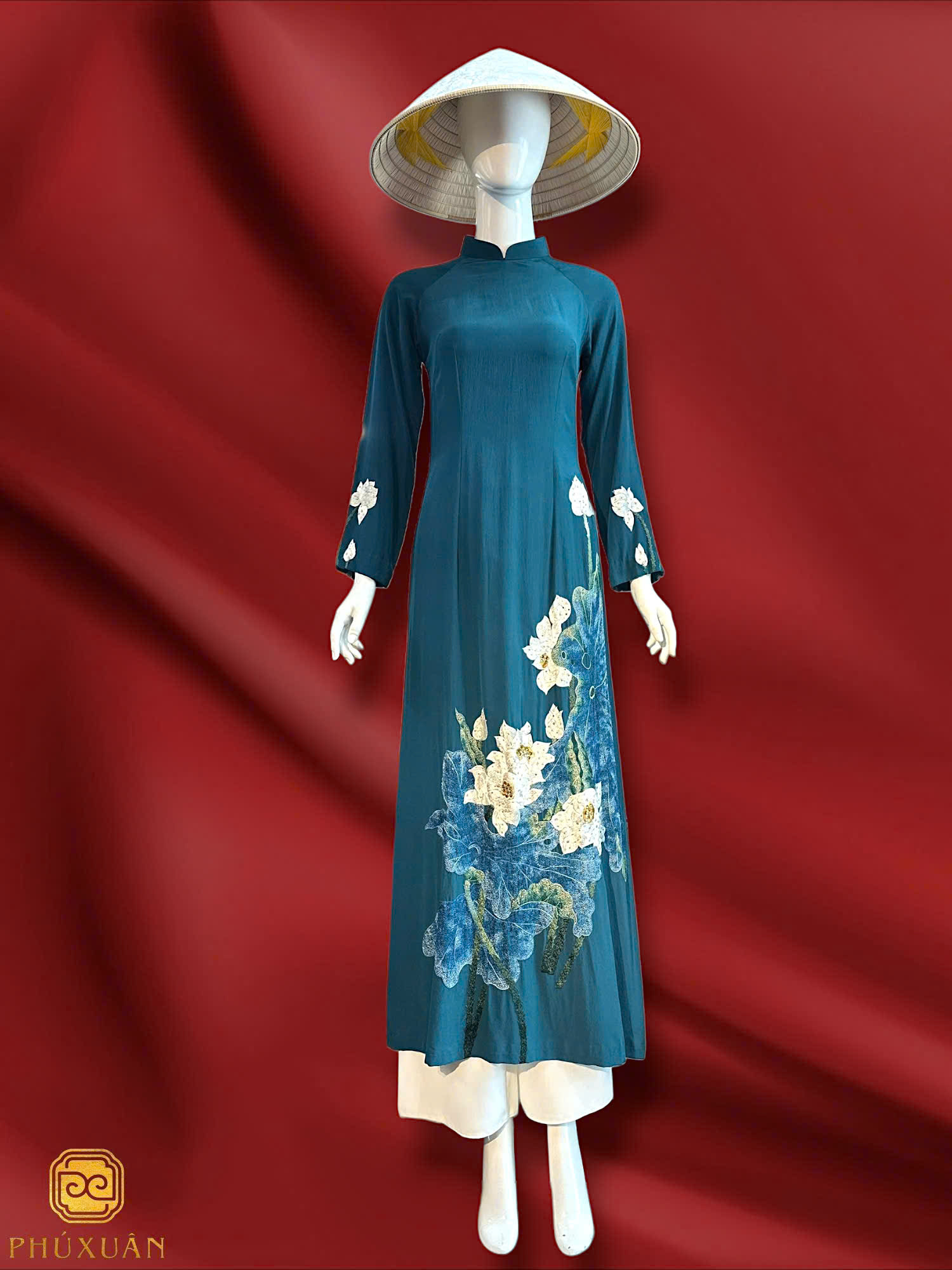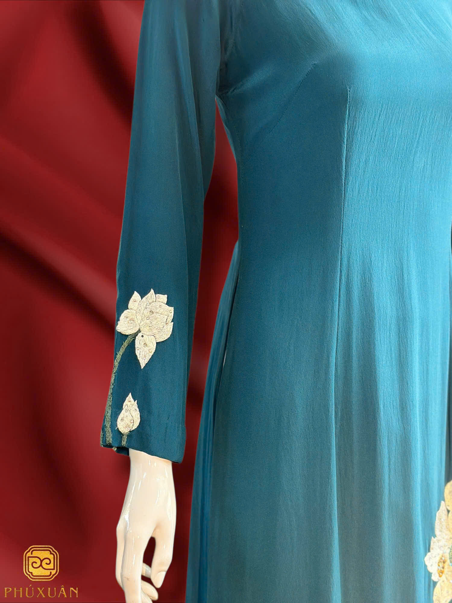 Chiếc áo dài mang tên “Ngọc Liên” là sự kết hợp tinh tế giữa vẻ đẹp thuần khiết và truyền thống Việt. Trên nền lụa xanh nhã nhặn, những bông sen trắng được thêu tay tỉ mỉ, hiện lên như biểu tượng của sự thanh cao và tâm hồn trong sáng. Mỗi đường kim mũi chỉ được người thợ Huế gửi gắm vào đó tình yêu với nghệ thuật thêu tay cổ truyền, tạo nên một tác phẩm không chỉ để mặc mà còn để cảm nhận. “Ngọc Liên” gợi nên hình ảnh người phụ nữ Việt – dịu dàng, thanh lịch mà vẫn kiên cường, như bông sen vươn mình giữa hồ nước trong, tỏa hương giữa đời thường.