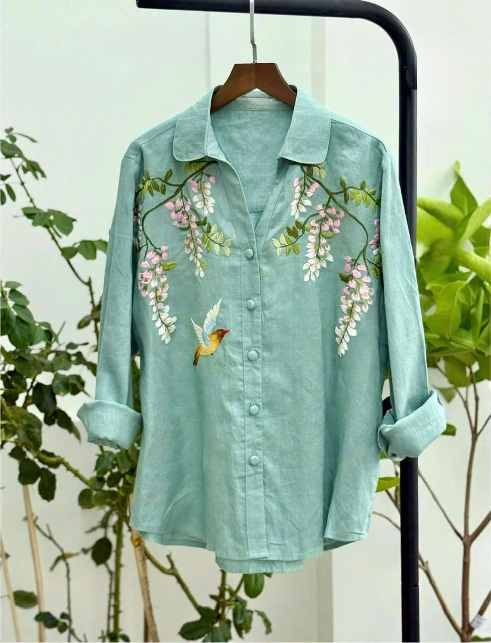 Áo sơ mi màu xanh thiên thanh thêu tay là thiết kế mang đến vẻ đẹp tươi mới, thanh lịch và đầy cá tính. Sắc xanh thiên thanh nhẹ nhàng gợi cảm giác mát mẻ, dễ chịu, phù hợp với mọi mùa. Họa tiết thêu tay giúp chiếc áo trở nên sinh động và thể hiện gu thẩm mỹ tinh tế của người mặc