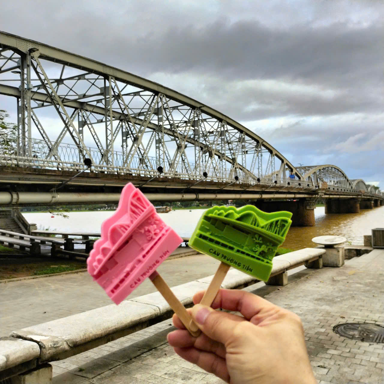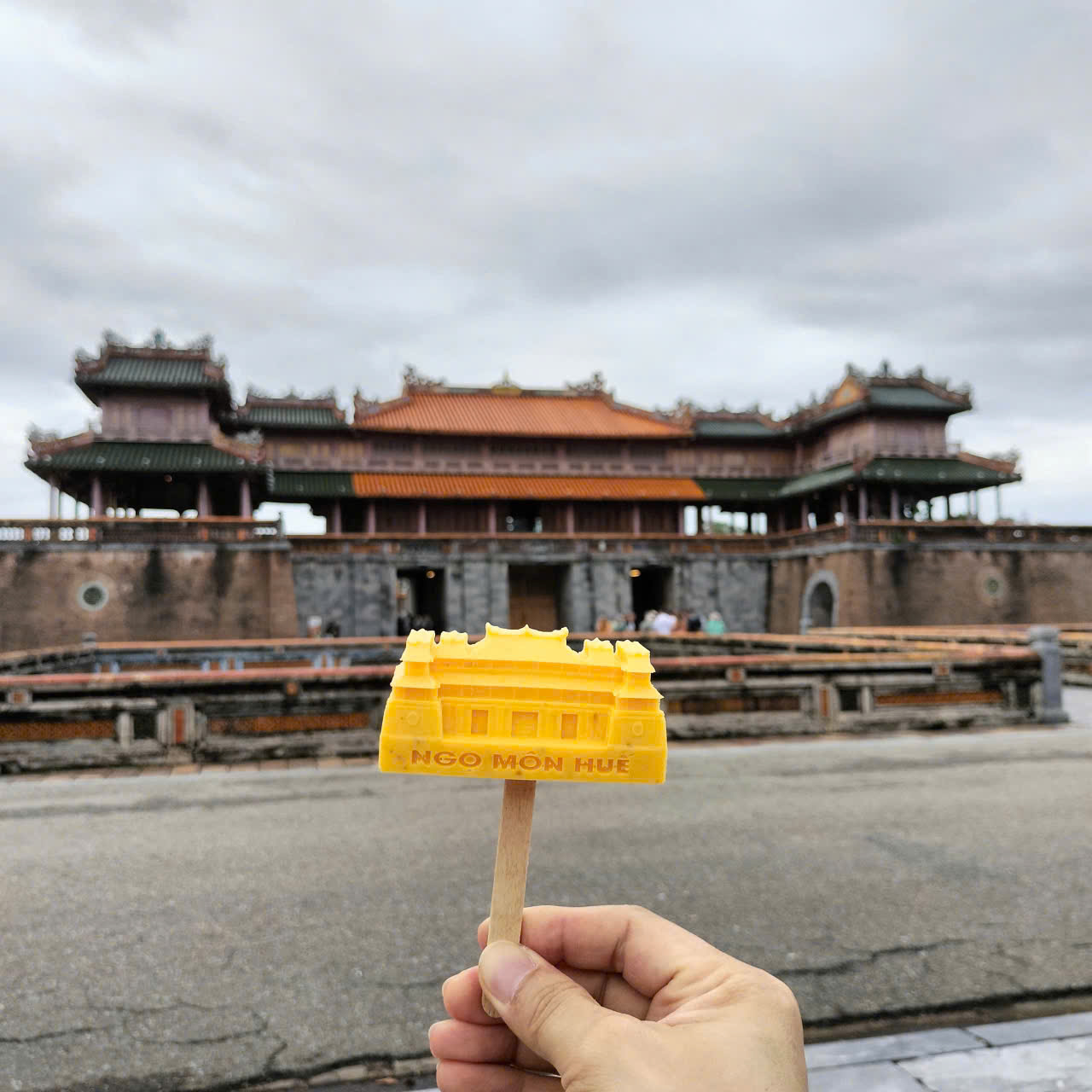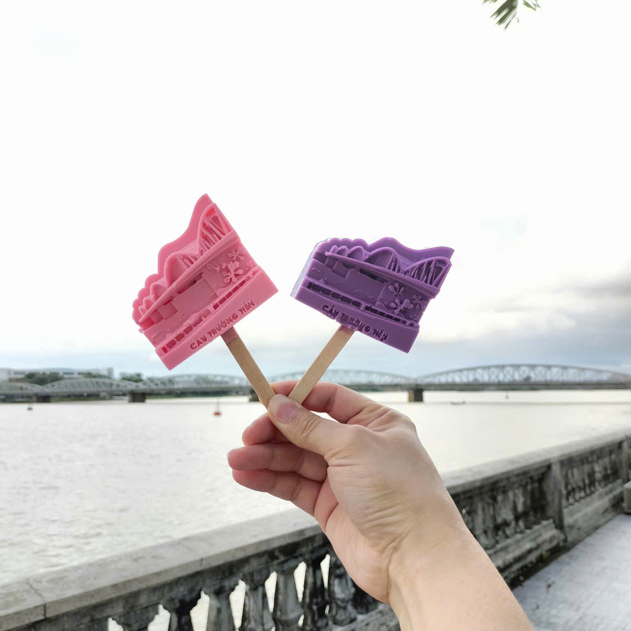 Những que kem được tạo hình theo các địa danh nổi tiếng như **cầu Trường Tiền, Kinh Thành Huế, Chùa Thiên Mụ, Lăng Tự Đức**, giúp thực khách không chỉ thưởng thức món ăn mà còn khám phá nét đẹp của cố đô theo một cách thú vị. Được làm từ các nguyên liệu tự nhiên như **sầu riêng, bơ, xoài, mãng cầu, trà xanh Thái Nguyên, cacao Đắk Lắk**, kem địa danh Huế mang đến vị ngọt thanh mát, vừa thơm ngon vừa gợi nhớ đến những sản vật của đất Việt. Giống như những món ăn từng được phục vụ trong cung điện Huế, kem địa danh không chỉ có hương vị hấp dẫn mà còn thể hiện sự khéo léo và tinh tế của người làm. Nếu có dịp đến Huế, du khách nhất định không nên bỏ lỡ trải nghiệm thưởng thức **KEM DI SẢN** – một sự kết hợp đầy sáng tạo giữa văn hóa và ẩm thực, giúp lưu giữ kỷ niệm về đất cố đô theo cách đặc biệt nhất.
