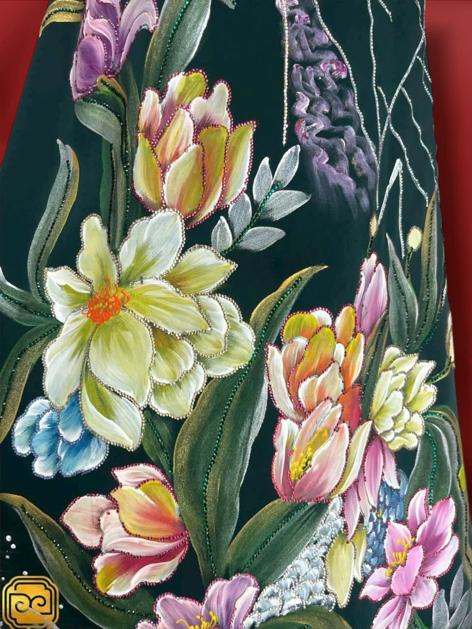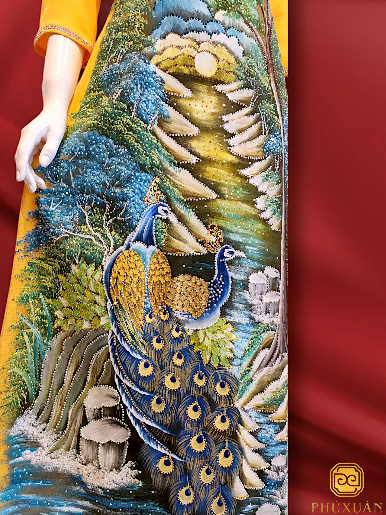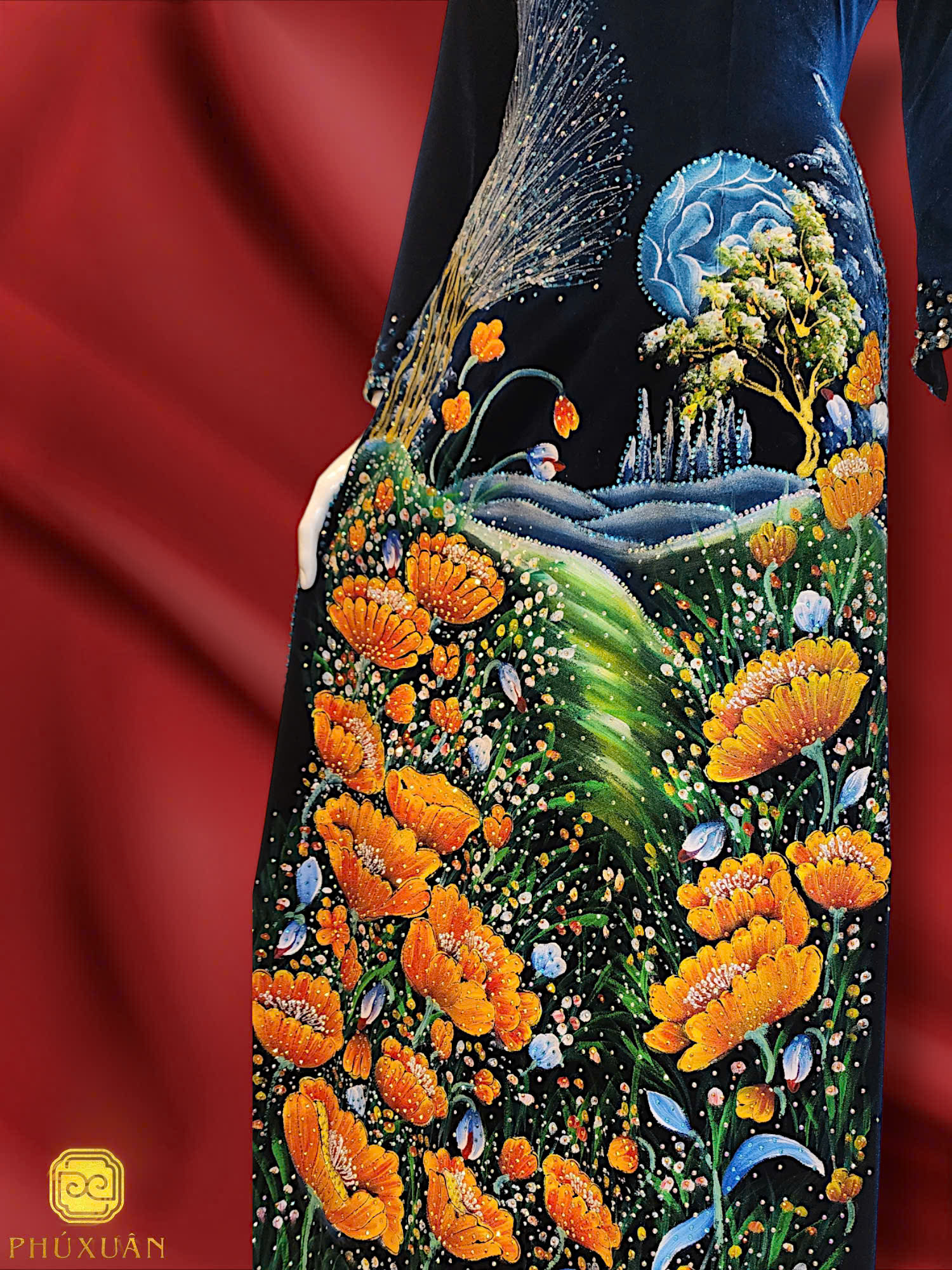 Mỗi tà áo là một sự hòa quyện giữa màu sắc, chất liệu và bàn tay người nghệ nhân. Nét vẽ không kể câu chuyện lớn, chỉ lặng lẽ lưu giữ những rung động rất nhỏ: một cánh hoa nghiêng, một vệt nắng rơi, hay khoảng trống được giữ lại để vẻ đẹp được thở.
