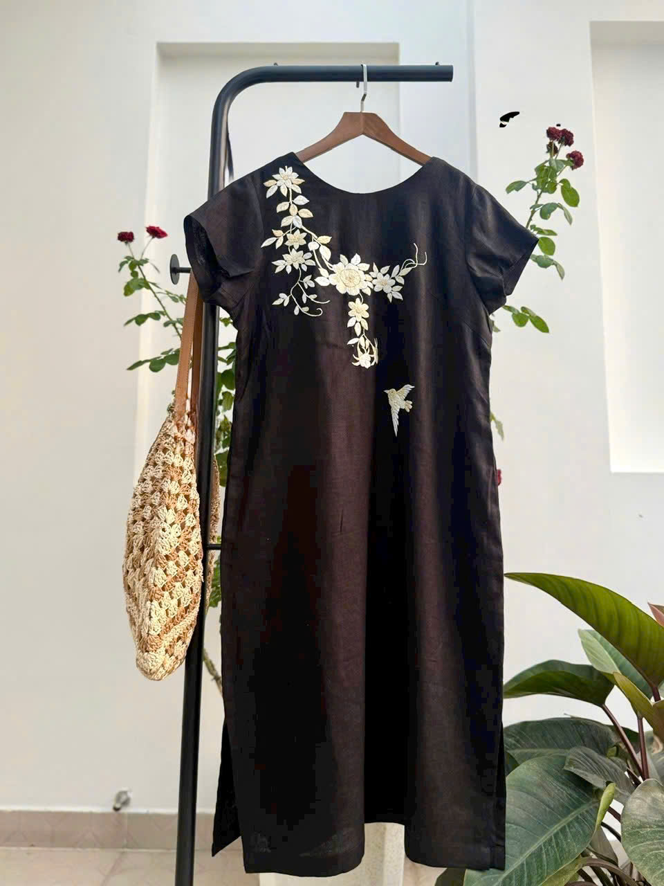 Linen với đặc tính mềm mại, hút ẩm tốt và thân thiện với làn da mang lại cảm giác thoải mái trong từng chuyển động. Khi được điểm xuyết bằng đường thêu tay – có thể là hoa lá, họa tiết hình học hay biểu tượng nghệ thuật – chiếc đầm trở nên sống động, thanh lịch và mang dấu ấn riêng.