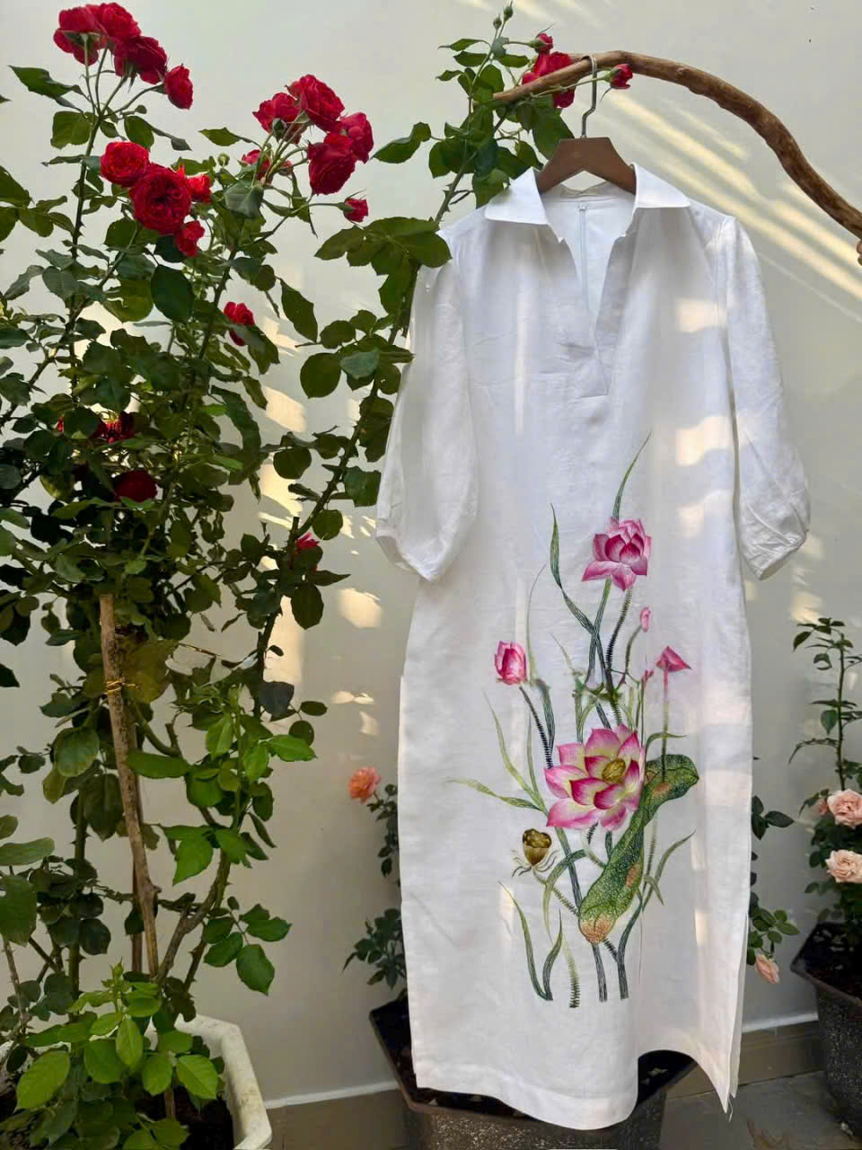 Linen với đặc tính mềm mại, hút ẩm tốt và thân thiện với làn da mang lại cảm giác thoải mái trong từng chuyển động. Khi được điểm xuyết bằng đường thêu tay – có thể là hoa lá, họa tiết hình học hay biểu tượng nghệ thuật – chiếc đầm trở nên sống động, thanh lịch và mang dấu ấn riêng.