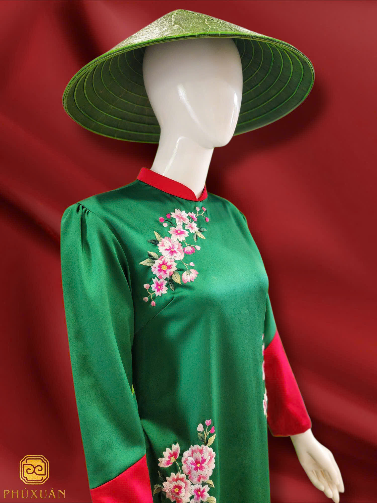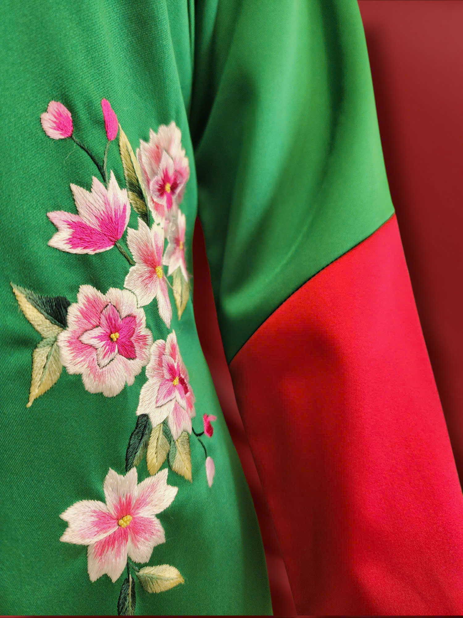 Với cấu trúc ghép chéo độc đáo giữa hai gam màu đối lập – xanh và đỏ – phần tà áo dài tạo nên hiệu ứng thị giác nổi bật, vừa cá tính, vừa mềm mại. Đường cắt chéo không chỉ là điểm nhấn phá cách mà còn khéo léo tôn dáng, giúp người mặc vừa thanh thoát vừa cuốn hút trong từng chuyển động