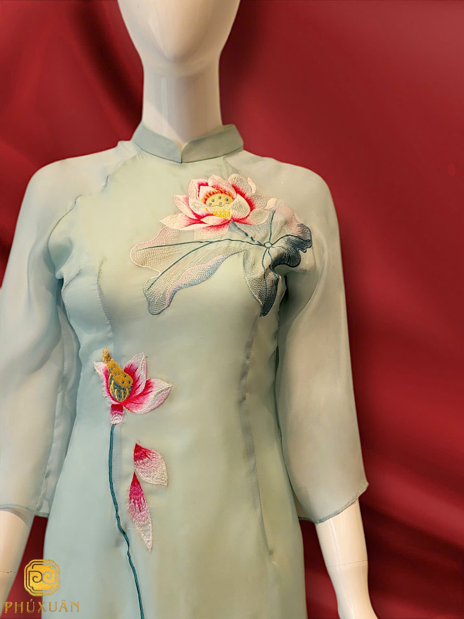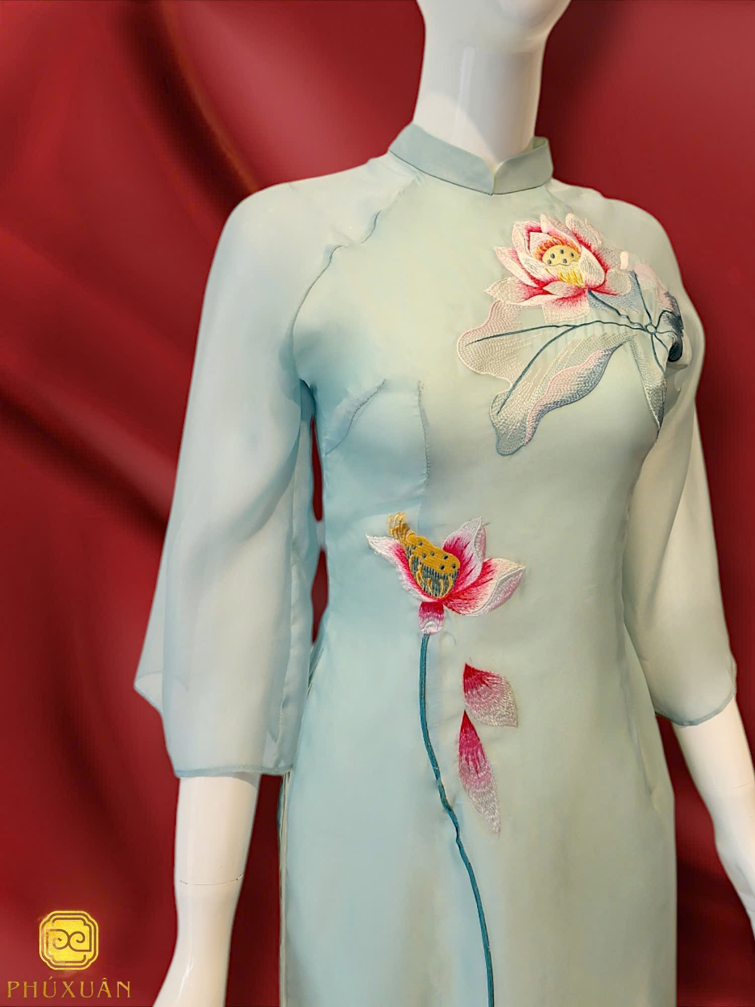 Mang sắc xanh thiên thanh dịu nhẹ như mây sớm, áo dài thêu hoa sen là biểu tượng của vẻ đẹp thuần khiết và thanh cao. Màu xanh thanh thoát gợi cảm giác bình yên, trong khi họa tiết hoa sen – loài hoa gắn liền với sự tinh khiết và trí tuệ – được thêu đầy nghệ thuật, tôn lên sự duyên dáng và nét truyền thống. Mẫu áo dài này là lựa chọn lý tưởng cho những dịp lễ trang trọng hay các sự kiện mang đậm bản sắc văn hóa.