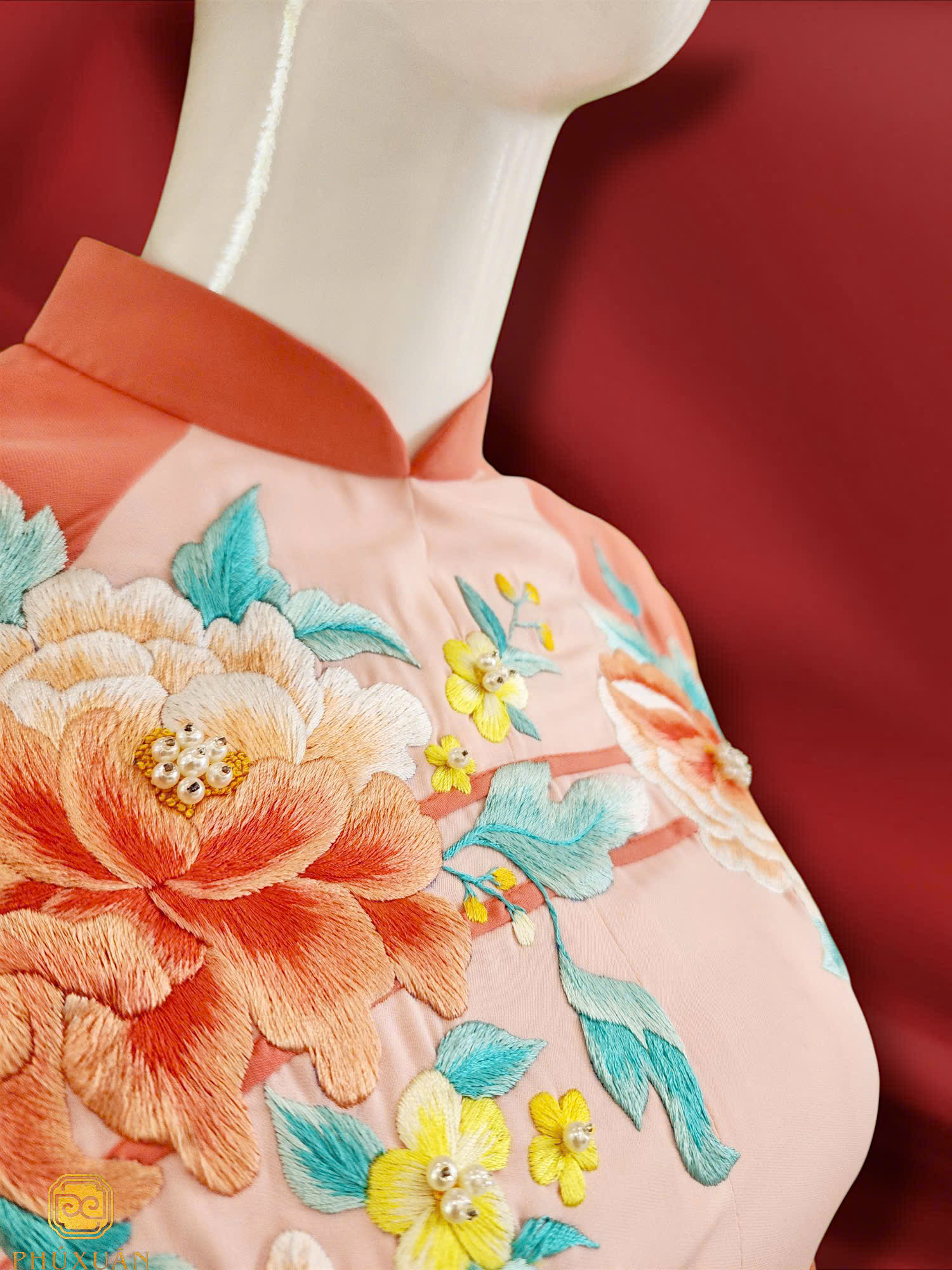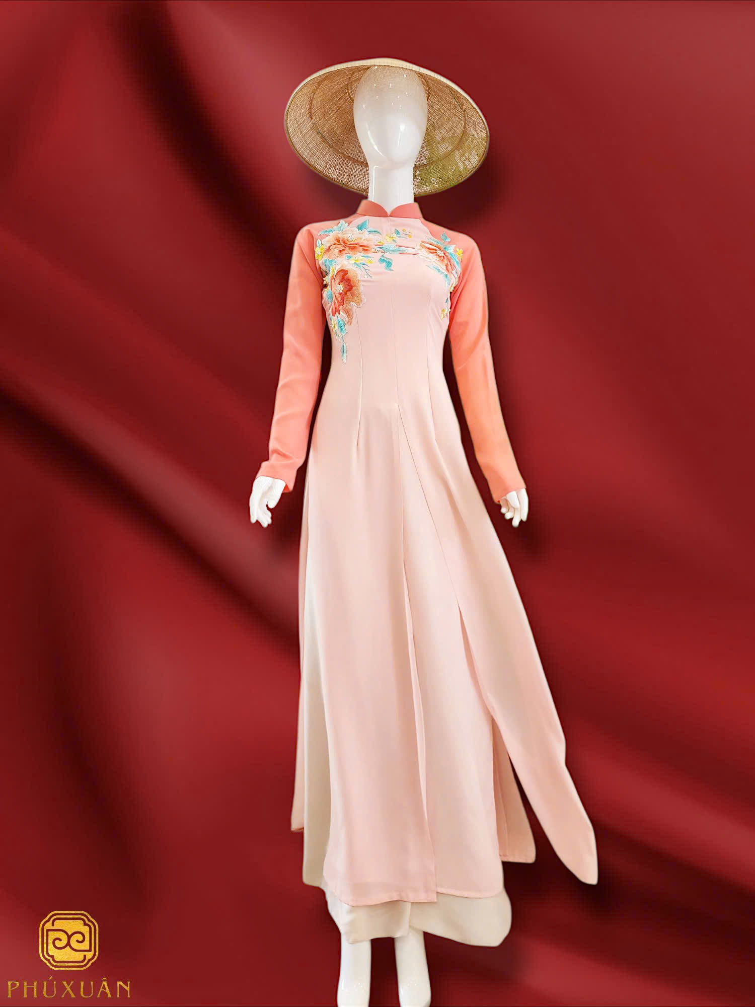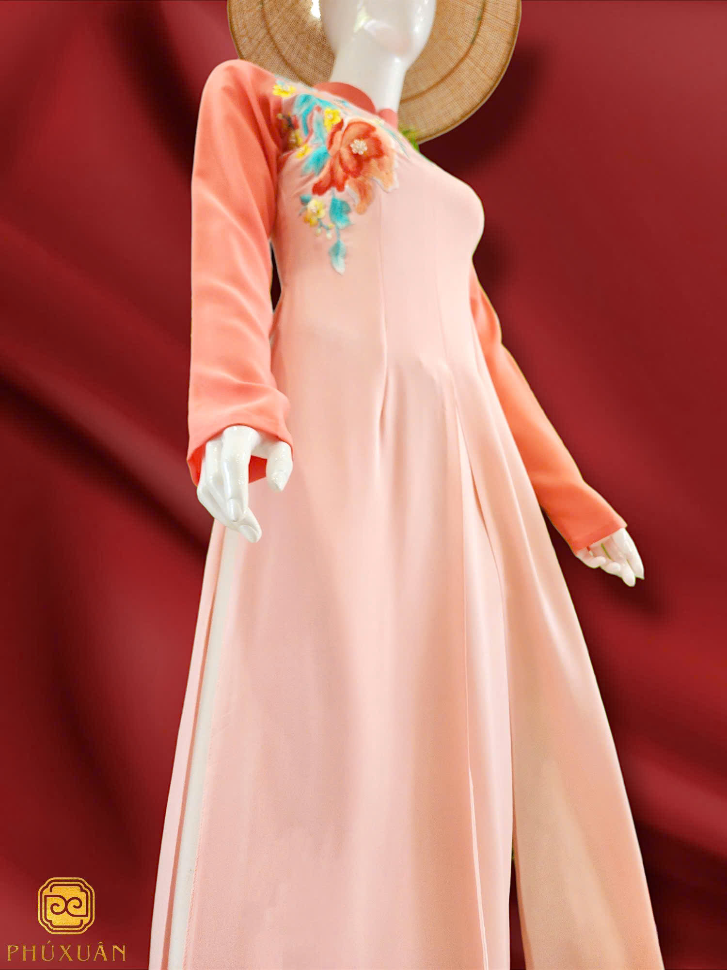 Chiếc áo dài mang phom dáng 4 tà độc đáo, tạo độ xoè mềm mại khi chuyển động, cùng chi tiết sẻ giữa tinh tế phía thân trước, giúp tôn dáng và tạo hiệu ứng thị giác hài hòa. Họa tiết thêu tay đặt khéo léo trên ngực là điểm nhấn nghệ thuật đầy chủ ý, vừa gợi sự mềm mại nữ tính vừa tôn lên nét cá tính kín đáo của người mặc