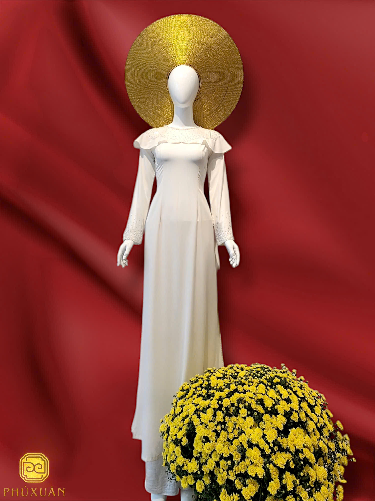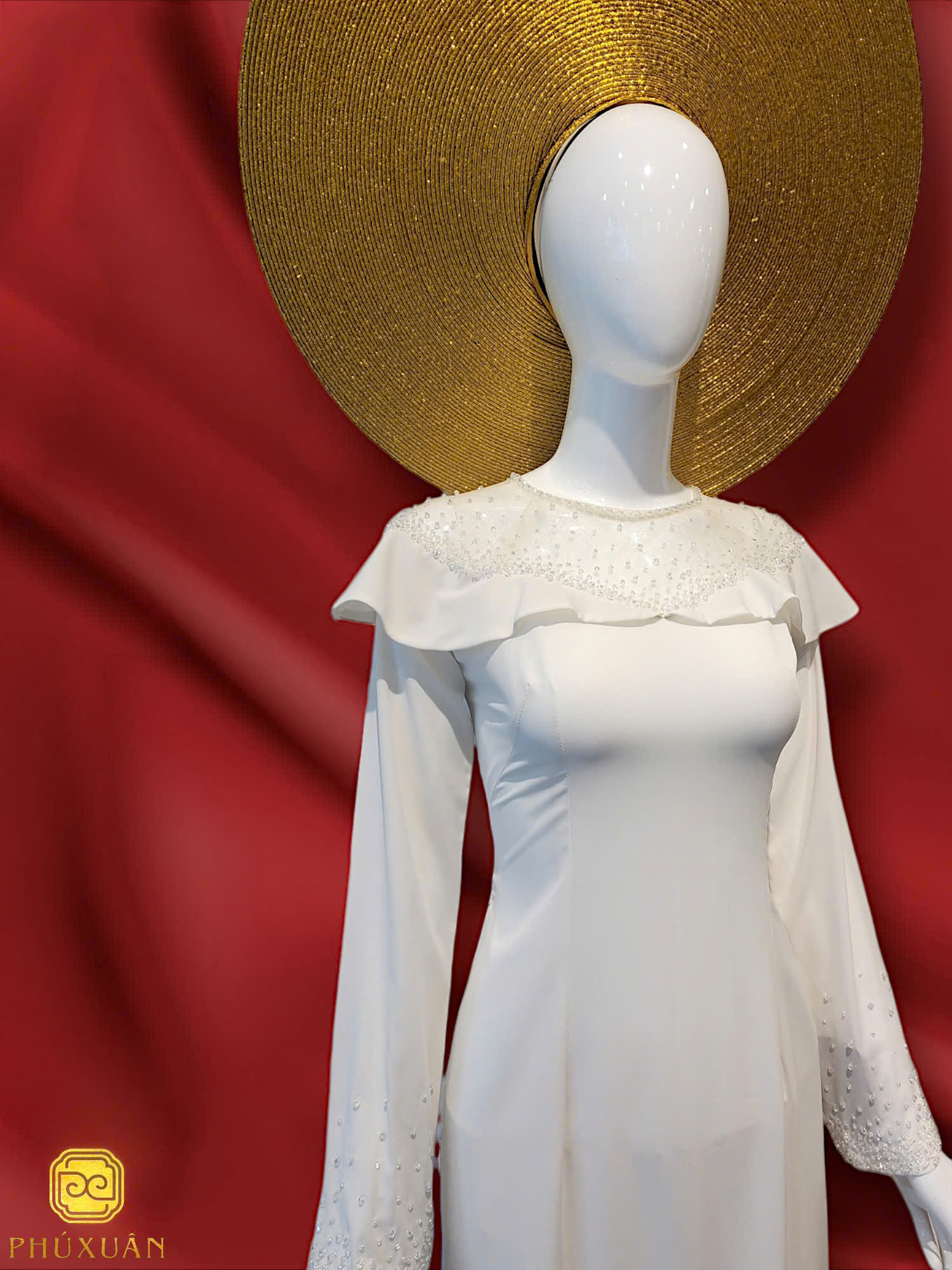 Chiếc áo dài trắng phối cổ ren và bèo ở phần ngực mang vẻ đẹp nữ tính và duyên dáng. Những đường đính đá lấp lánh nơi cổ áo như ánh sao dịu dàng tô điểm cho diện mạo người mặc, khiến tổng thể trở nên thu hút và sang trọng. Sự kết hợp giữa chất liệu mềm mại và chi tiết cổ điển tạo nên một thiết kế vừa hiện đại vừa đậm chất thơ.