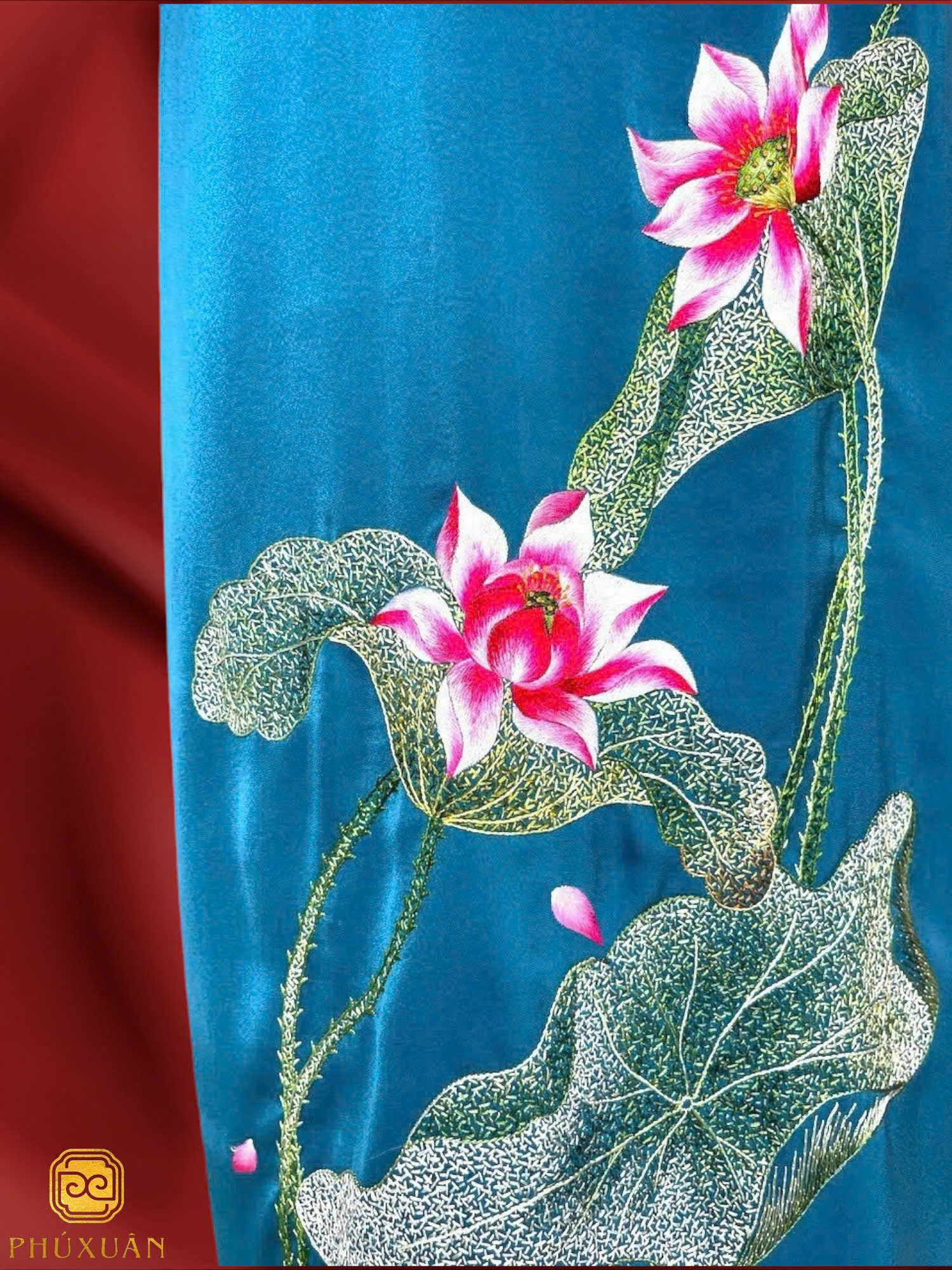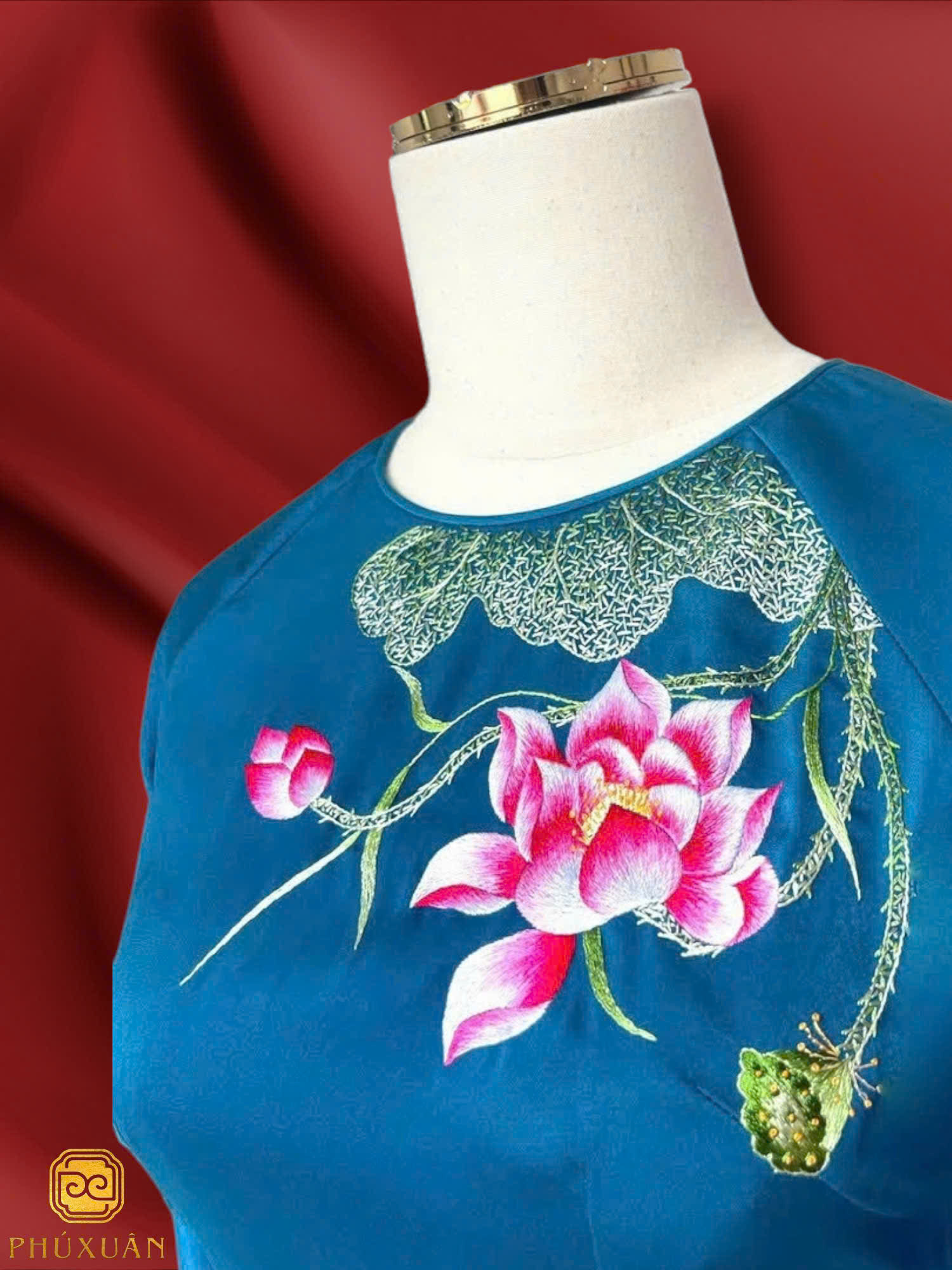 Được chế tác từ chất liệu lụa thượng hạng, thiết kế áo dài ‘Hạc Nhi’ là sự kết hợp hài hòa giữa phom dáng truyền thống và nghệ thuật thêu tay hiện đại. Họa tiết hoa sen – biểu tượng của sự thuần khiết và vươn lên không ngừng – được khắc họa sống động trên phần tay áo và ngực áo, tạo nên tổng thể đầy trang nhã và tinh tế