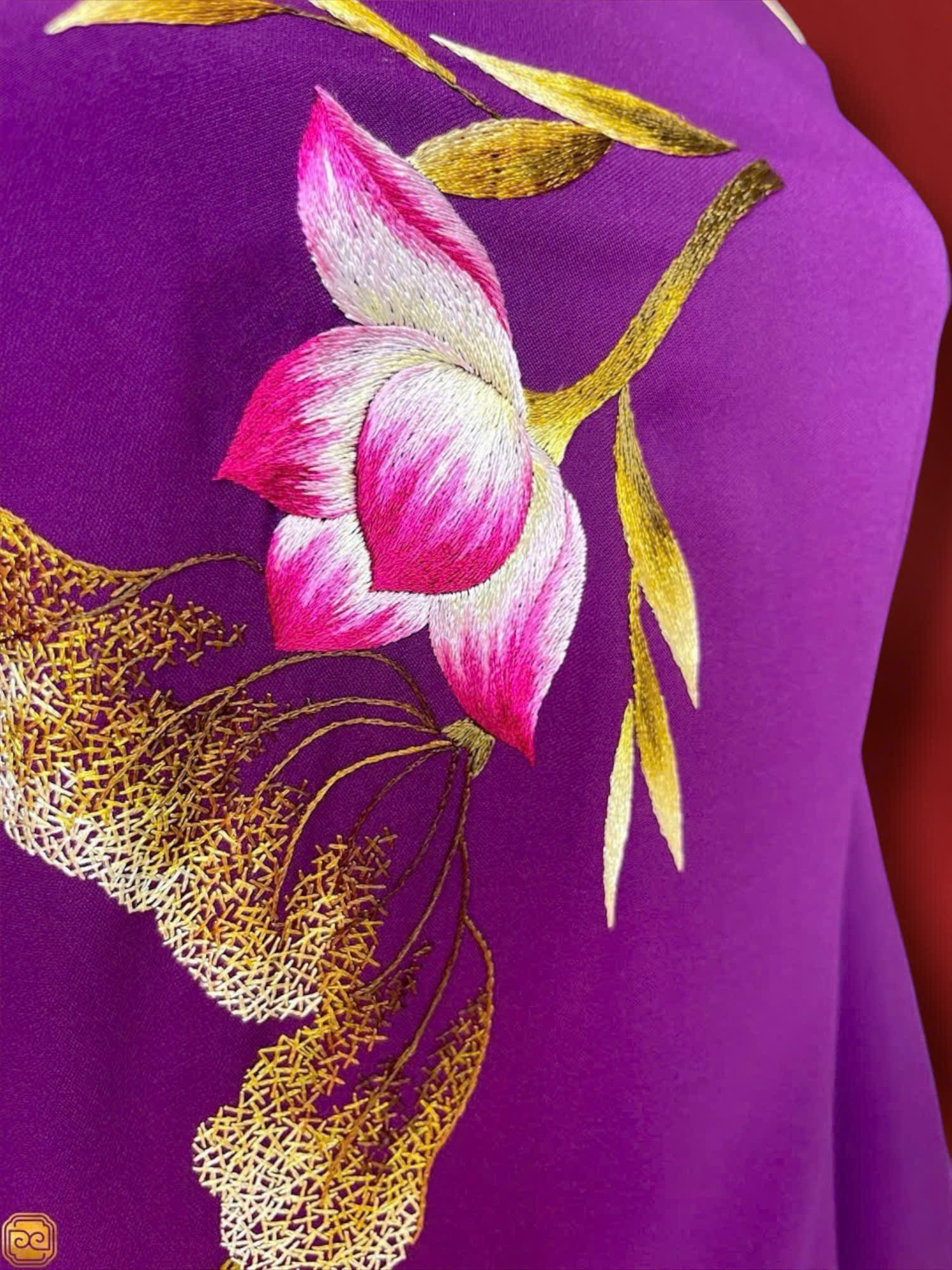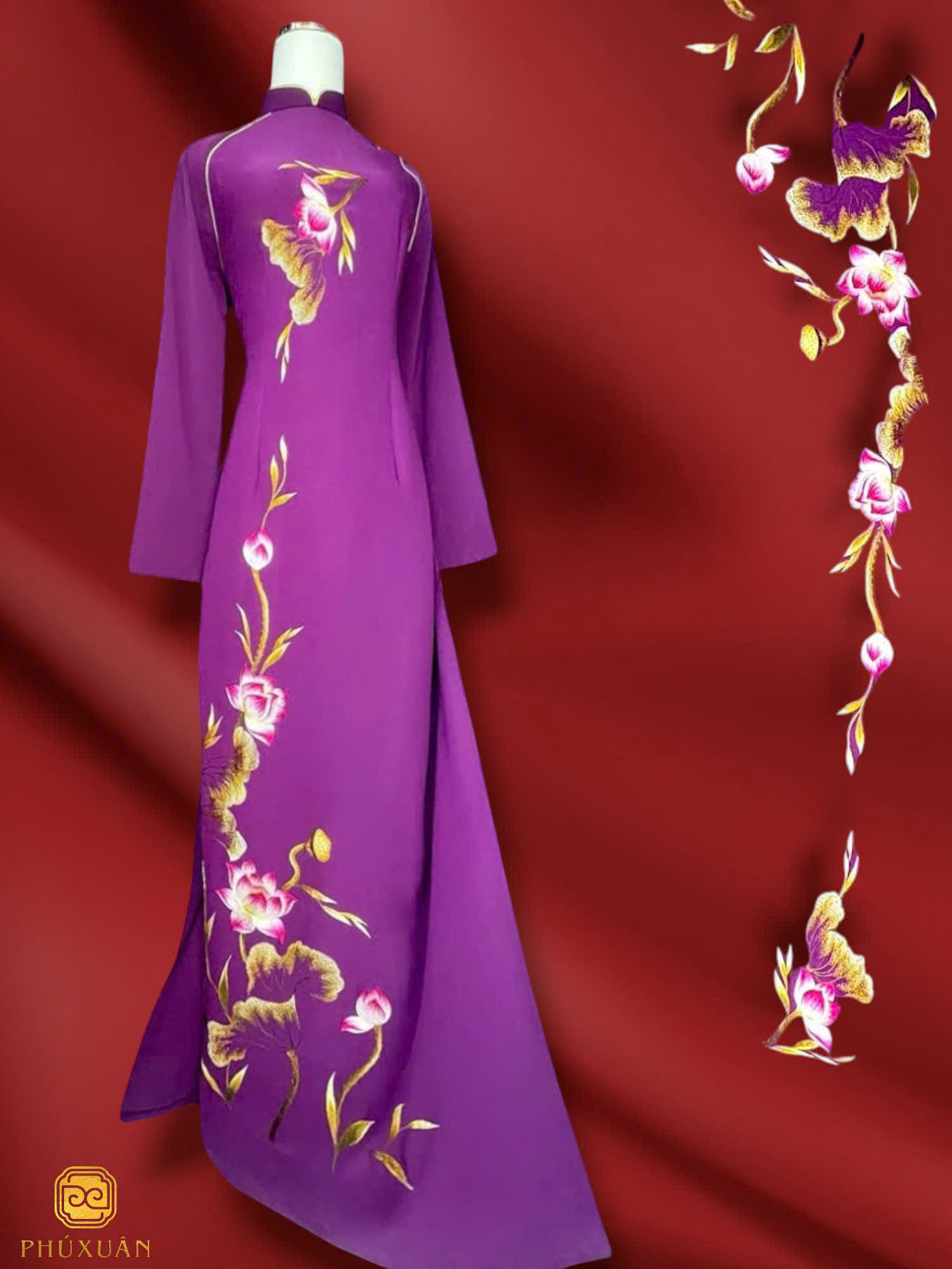 Áo dài thêu tay màu tím Huế họa tiết hoa sen là sự hòa quyện tinh tế giữa sắc tím trầm lắng đặc trưng xứ Kinh kỳ và hình ảnh hoa sen – biểu tượng của sự thanh cao, tinh khiết. Màu tím gợi nét dịu dàng, sâu lắng, trong khi những bông sen được thêu tay tỉ mỉ trên nền lụa tạo nên điểm nhấn trang nhã, đậm chất truyền thống. Đây là lựa chọn lý tưởng cho những dịp lễ trang trọng, nơi người mặc muốn tôn vinh vẻ đẹp nền nã và bản sắc Việt.