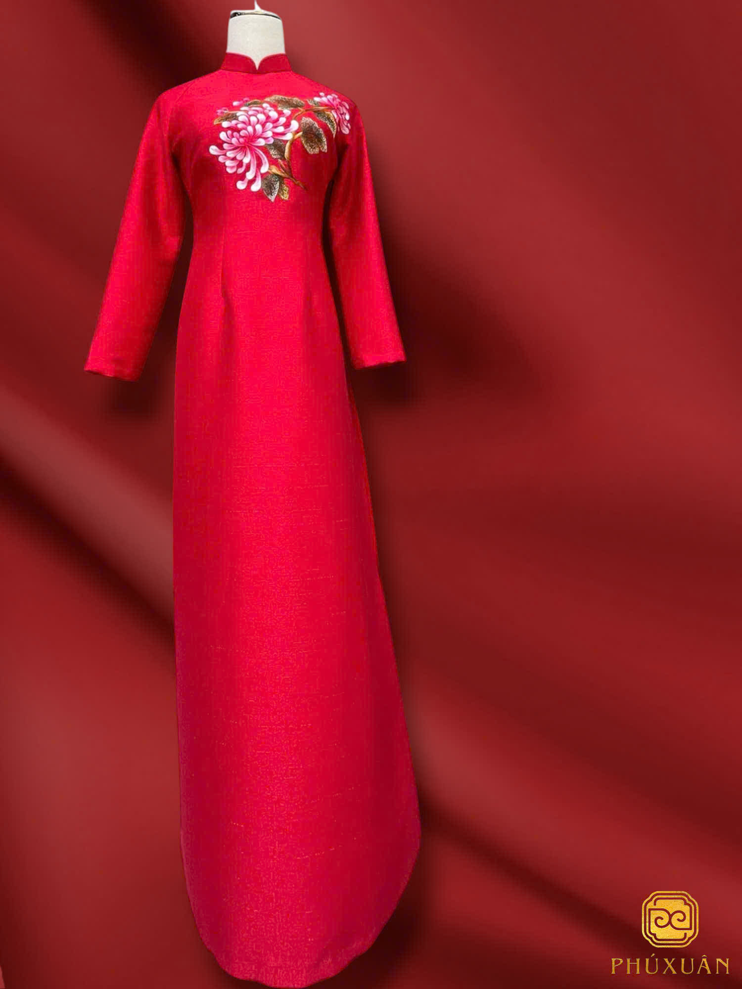 Áo dài tơ bốn tà thêu hoa cúc là một thiết kế đậm chất nghệ thuật, tôn vinh vẻ đẹp truyền thống mà vẫn mang nét phá cách tinh tế. Chất liệu tơ tằm nhẹ, óng ánh và mềm mại tạo nên sự uyển chuyển trong từng bước đi, còn kiểu dáng bốn tà lại đem đến vẻ phóng khoáng, độc đáo, gợi cảm giác như cánh gió lướt qua lặng lẽ.