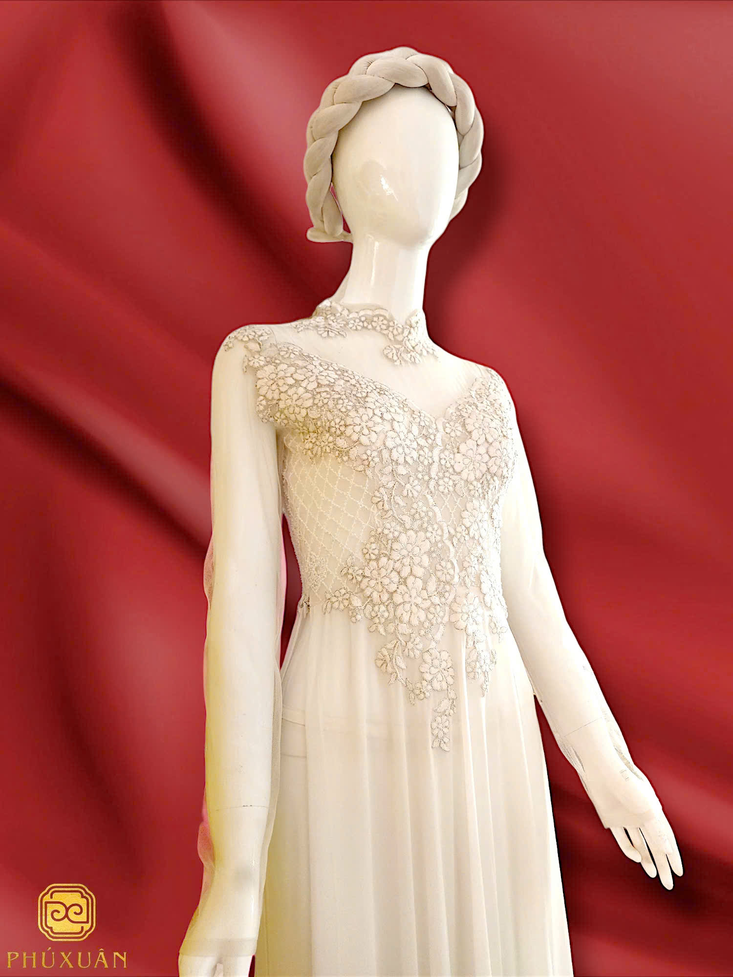 Tinh khôi và thanh thoát, mẫu áo dài thêu hoa nhí trắng trên nền lụa trắng là bản hoà ca dịu nhẹ của sự giản đơn và tinh tế. Mỗi đóa hoa nhỏ được thêu tay tỉ mỉ, như lời thì thầm của mùa xuân trên từng nếp vải.