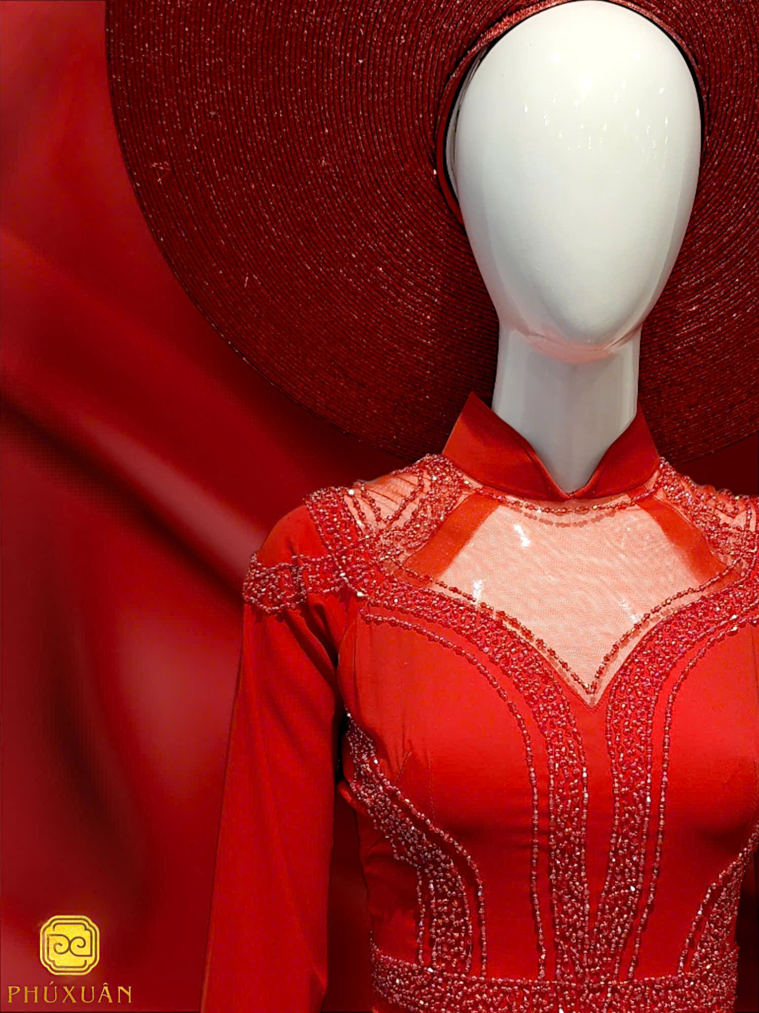 Tỏa sáng với vẻ đẹp rực rỡ và tinh tế, chiếc áo dài đỏ được phối ren cắt may khéo léo, kết hợp cùng những đường đính đá cùng tông đỏ lấp lánh, mang lại hiệu ứng thị giác nổi bật và quý phái. Sự hòa quyện giữa sắc đỏ quyền lực và chi tiết thủ công tinh xảo giúp chiếc áo trở thành điểm nhấn hoàn hảo trong mọi sự kiện trang trọng.