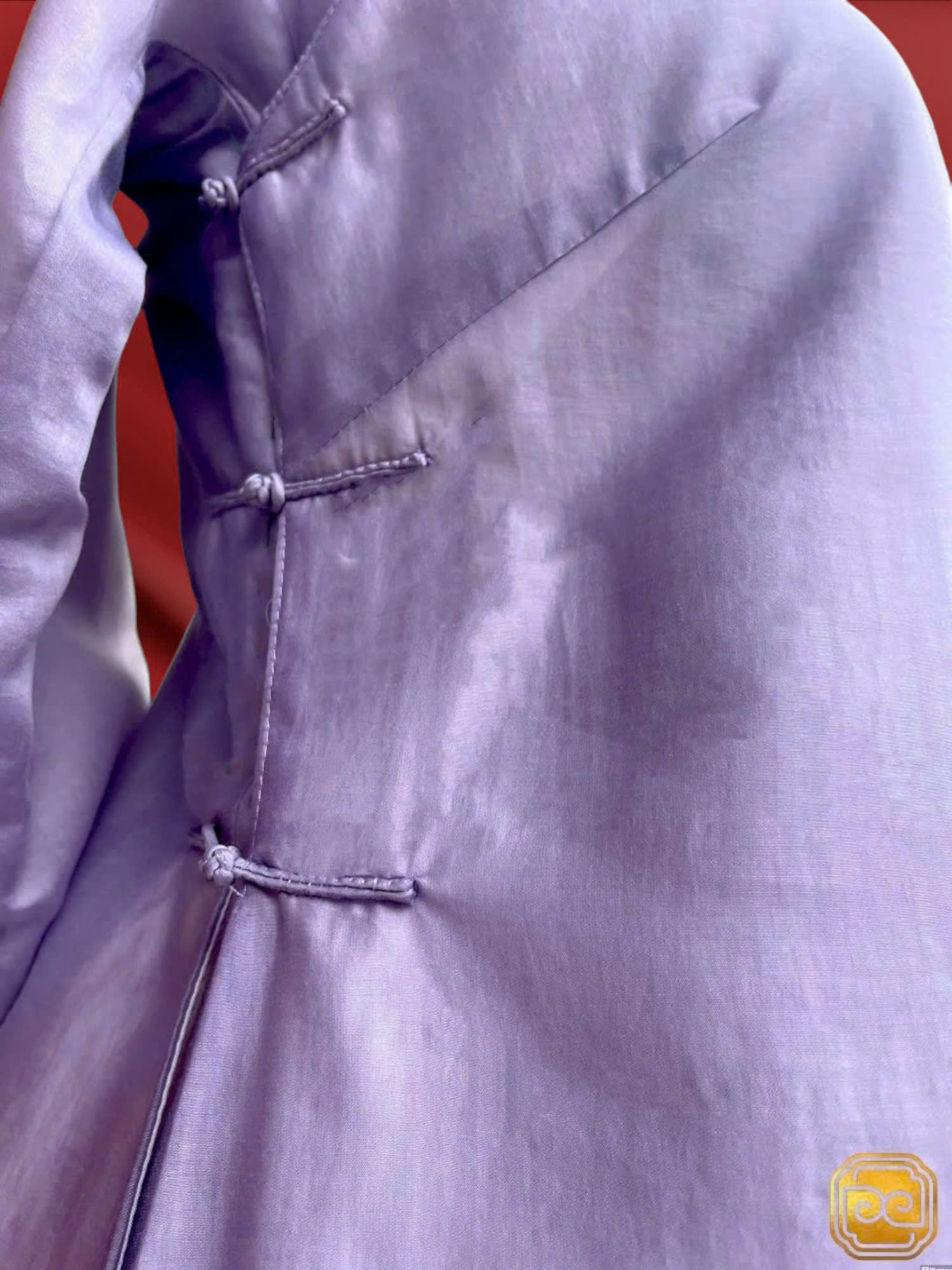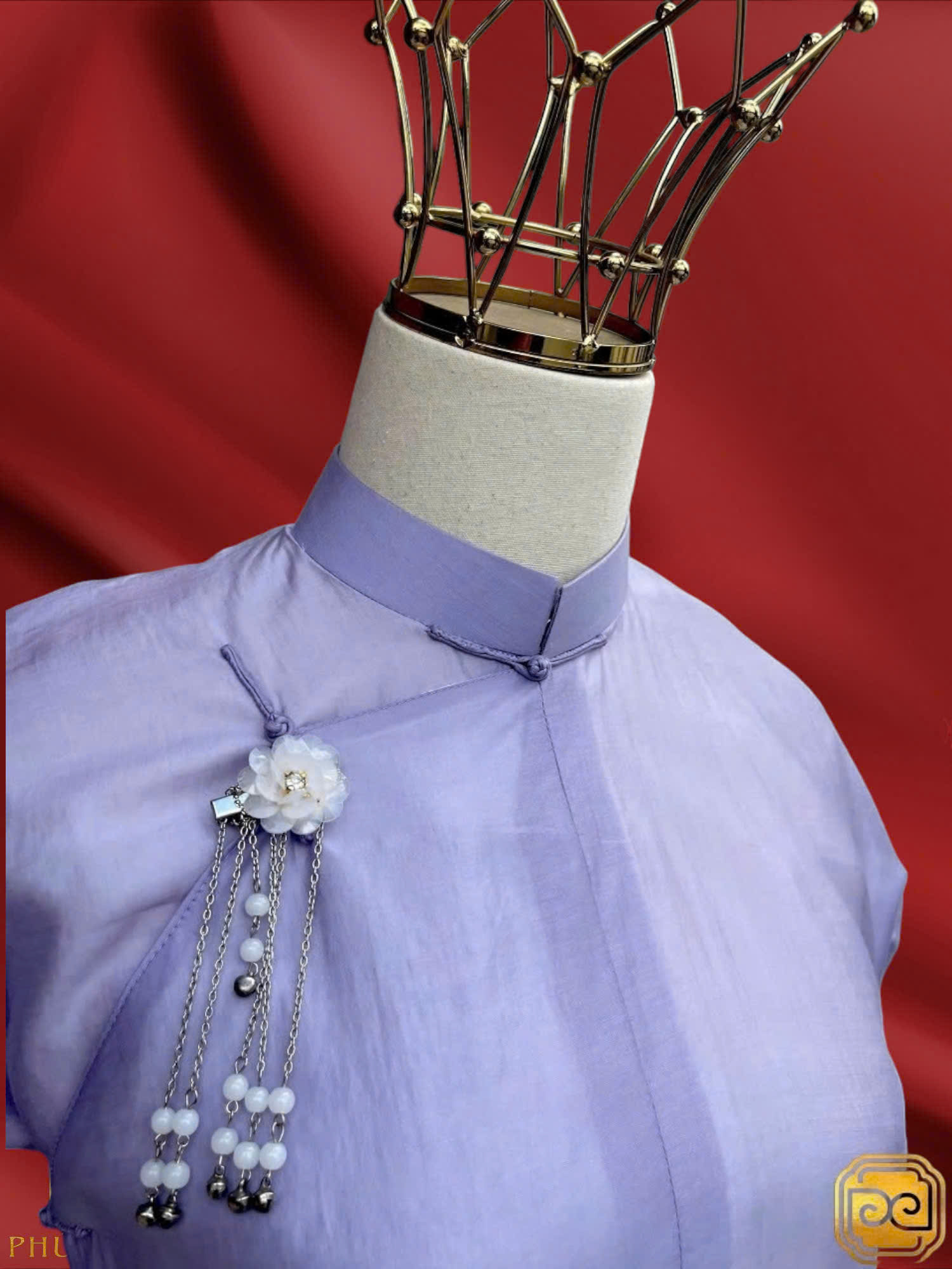 Áo ngũ thân tím nhạt mang vẻ đẹp nhẹ nhàng, thanh lịch và thấm đẫm chất thơ. Tông tím nhạt gợi nét dịu dàng, kín đáo, vừa cổ điển lại vừa phù hợp với thẩm mỹ hiện đại. Kiểu dáng năm thân truyền thống tôn lên sự chỉn chu, chuẩn mực, lý tưởng cho các dịp lễ nghi hoặc không gian nghệ thuật.