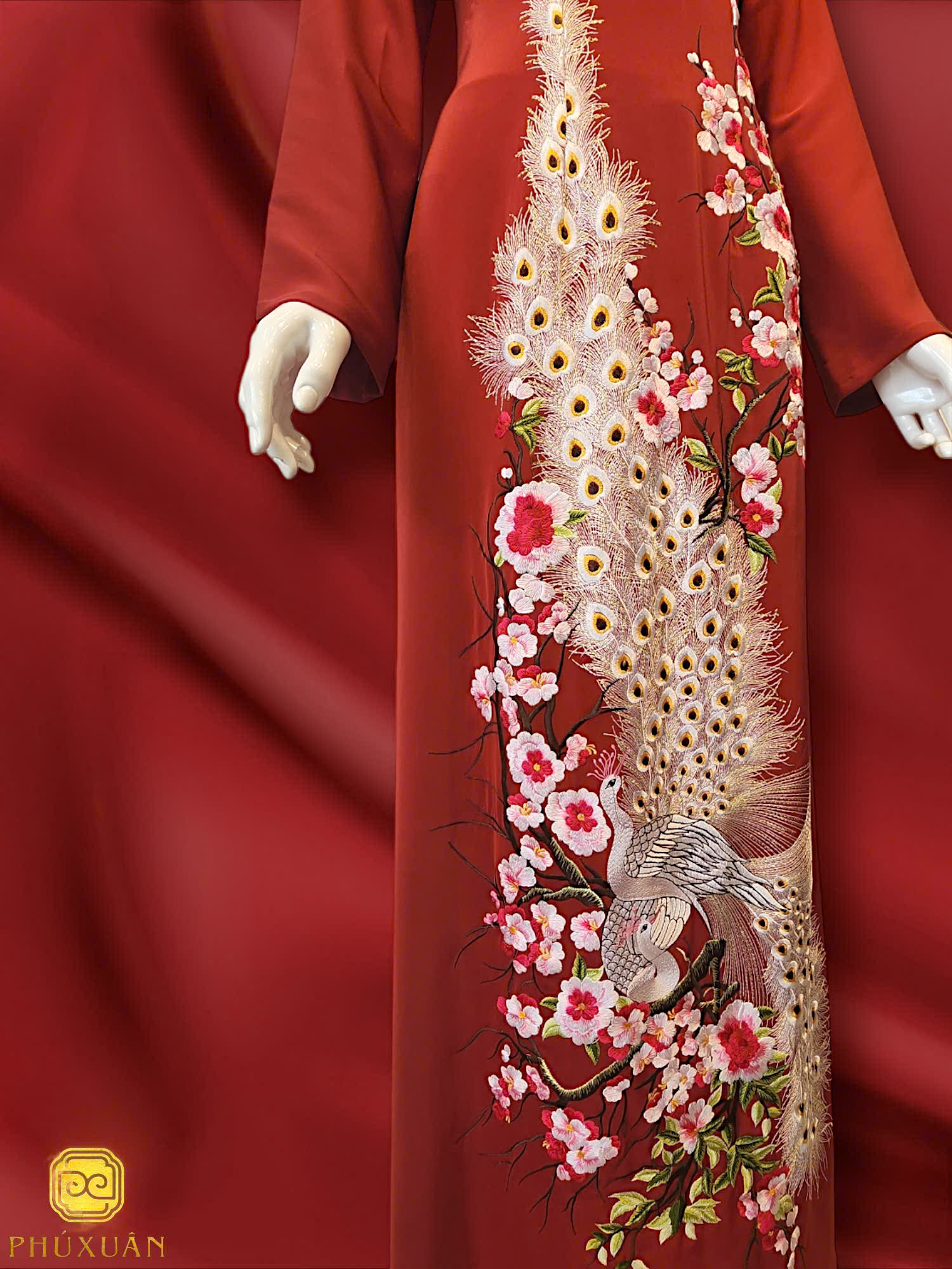 Áo dài lụa thêu công khoác lên mình vẻ kiêu sa và đầy mê hoặc với từng sợi chỉ thêu họa tiết chim công – biểu tượng của sắc đẹp, may mắn và vương giả. Chất liệu lụa mềm mại hòa quyện cùng kỹ thuật thêu thủ công tinh xảo tạo nên một tổng thể đầy cuốn hút, tôn vinh vẻ đẹp duyên dáng và quyền quý của người phụ nữ Việt.