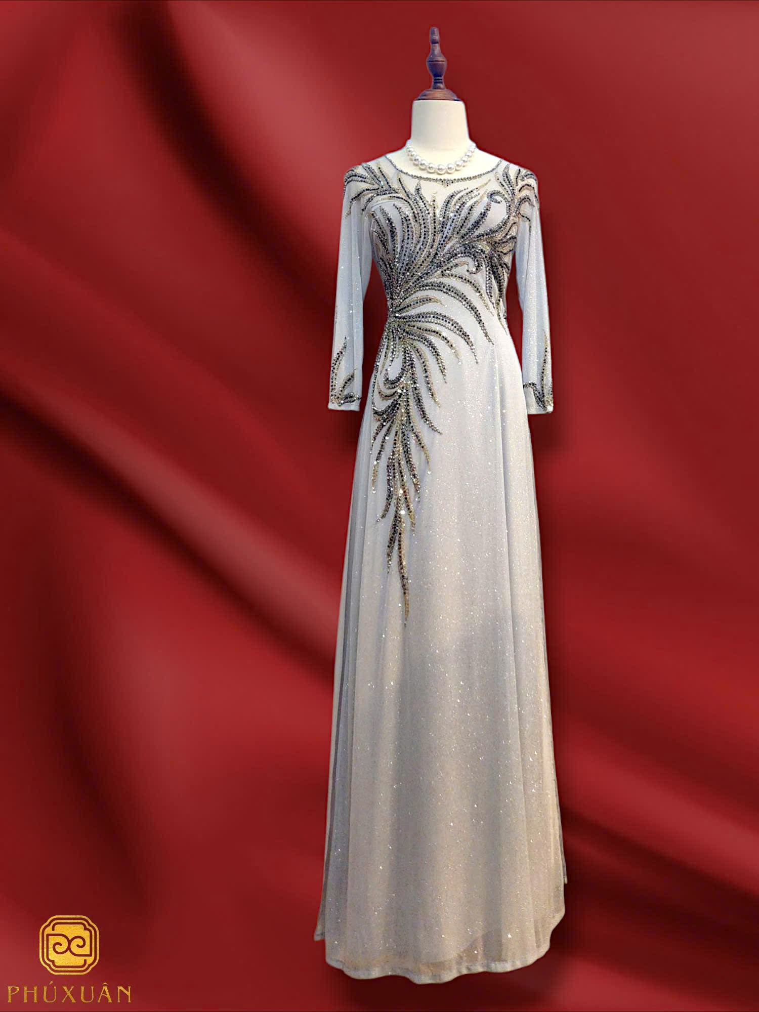 Tỏa sáng dịu dàng nhưng đầy cuốn hút, chiếc áo dài với chất liệu ánh bạc kết hợp họa tiết đính kết sang trọng mang đến vẻ đẹp hiện đại mà vẫn giữ được tinh thần truyền thống. Ánh bạc nhẹ nhàng bắt sáng theo từng chuyển động, trong khi các chi tiết đính kết thủ công tạo điểm nhấn lấp lánh, khẳng định phong cách thanh lịch và đẳng cấp của người mặc.