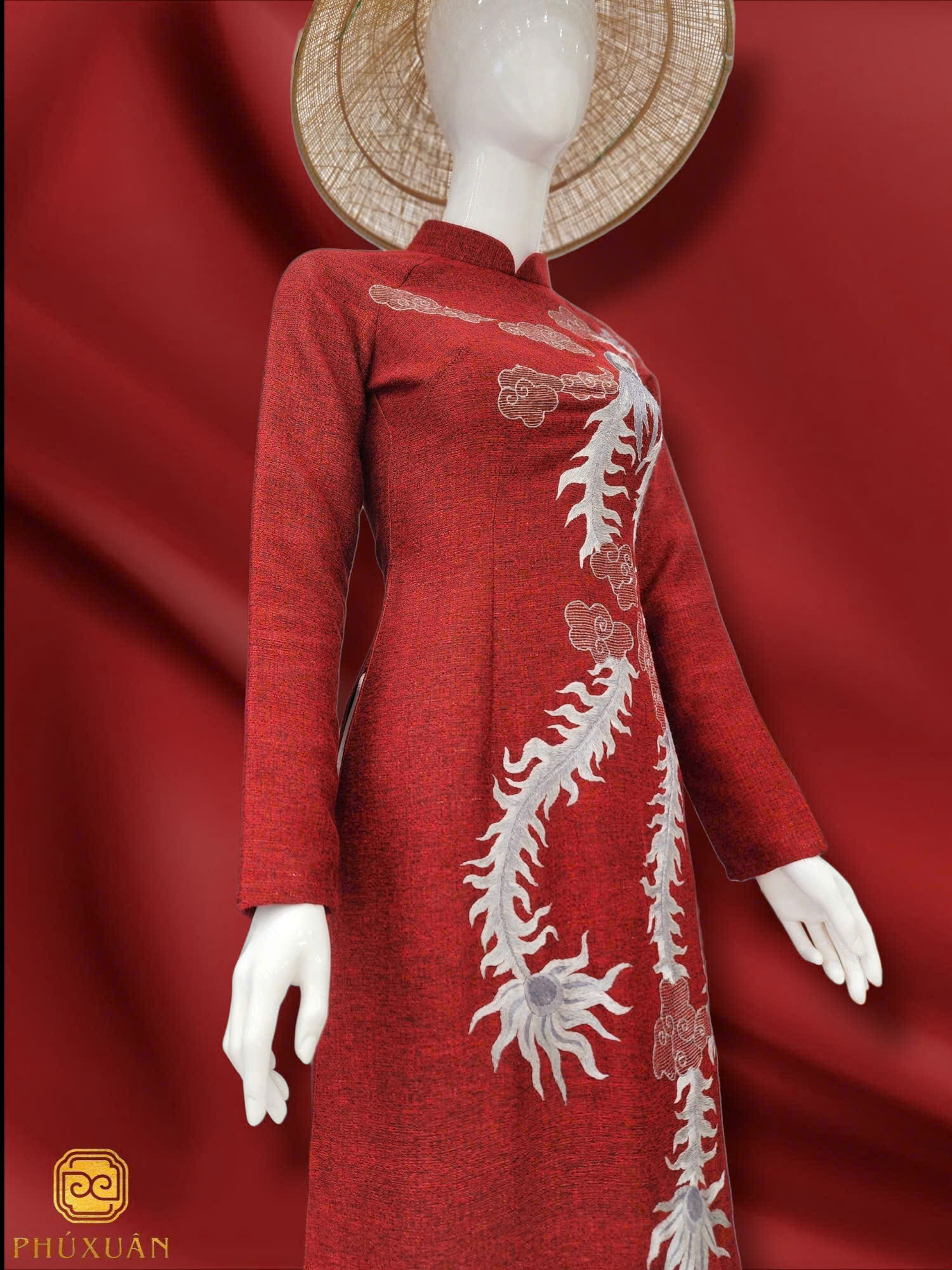 Áo dài từ chất liệu sợi tre dệt màu đỏ kết hợp thêu tay họa tiết chim phượng hoàng là thiết kế đầy khí chất và bản sắc. Vải tre thiên nhiên mang đến sự mềm mại, thoáng mát và thân thiện với làn da, trong khi sắc đỏ quyền lực cùng hình ảnh phượng hoàng uy nghi tạo nên tổng thể sang trọng, kiêu hãnh. Họa tiết thêu tay tinh xảo góp phần tôn vinh vẻ đẹp truyền thống xen lẫn nét hiện đại.