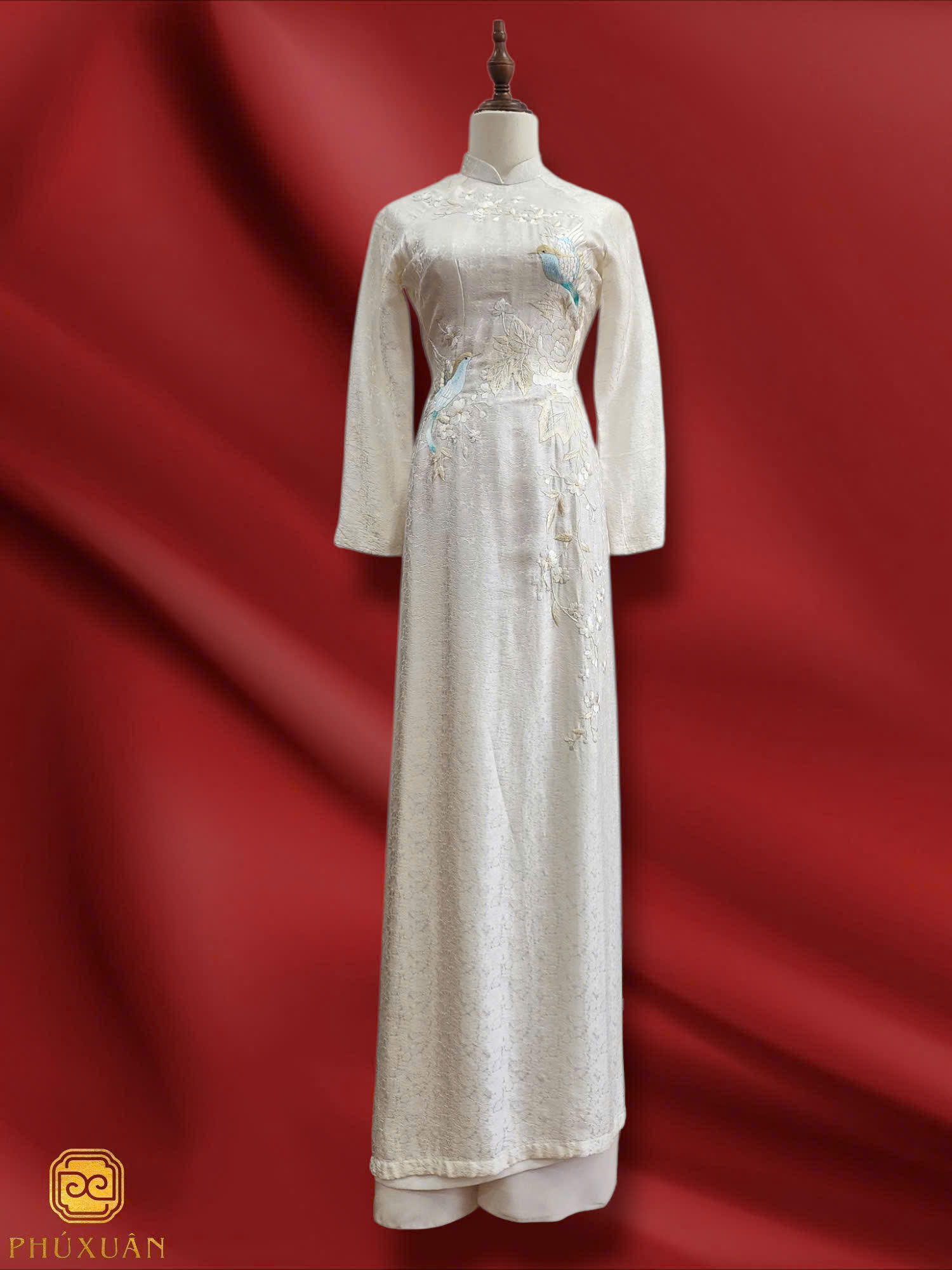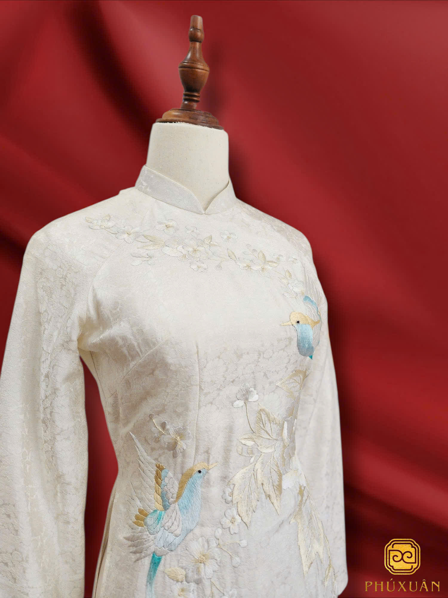 Áo dài trắng thêu tay hình đôi uyên ương là biểu tượng cho tình yêu thủy chung và vẻ đẹp tinh khôi. Chất liệu cao cấp giúp áo giữ dáng mềm mại, tôn nét duyên dáng cho người mặc. Họa tiết uyên ương nổi bật vừa mang ý nghĩa gắn kết, vừa tạo điểm nhấn trang nhã và đầy nghệ thuật.
