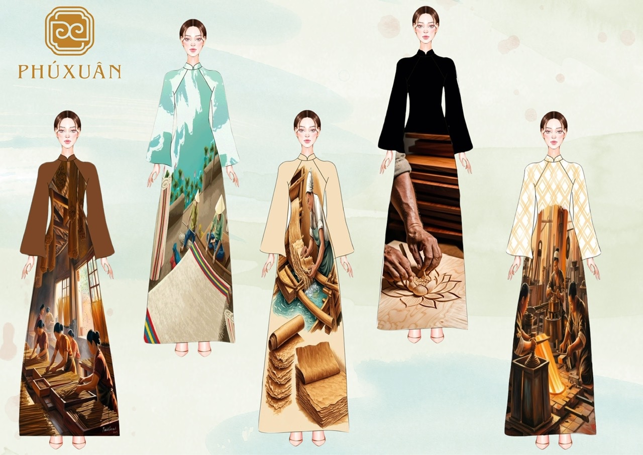 Bộ áo dài với hình ảnh in công đoạn điêu khắc gỗ tái hiện sự tinh xảo và tâm huyết của làng nghề truyền thống. Những hoa văn chạm trổ sắc nét phản ánh đôi bàn tay khéo léo, kiên trì của người thợ, mang đến vẻ đẹp vừa mộc mạc, vừa nghệ thuật. Gam màu trầm ấm cùng họa tiết tinh tế tạo nên một thiết kế đầy chiều sâu, tôn vinh giá trị di sản văn hóa Việt Nam. Khoác lên mình bộ áo dài này là cách trân trọng và lưu giữ một nghề thủ công lâu đời.