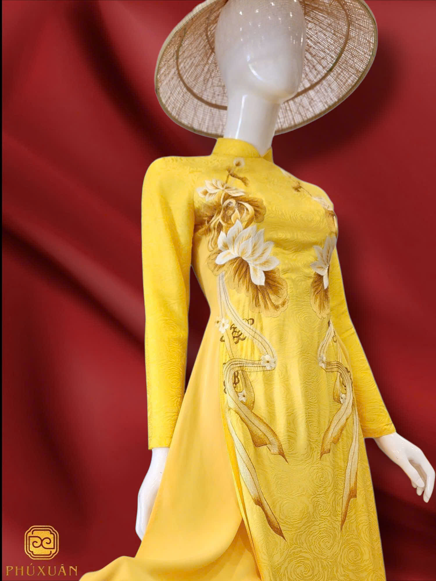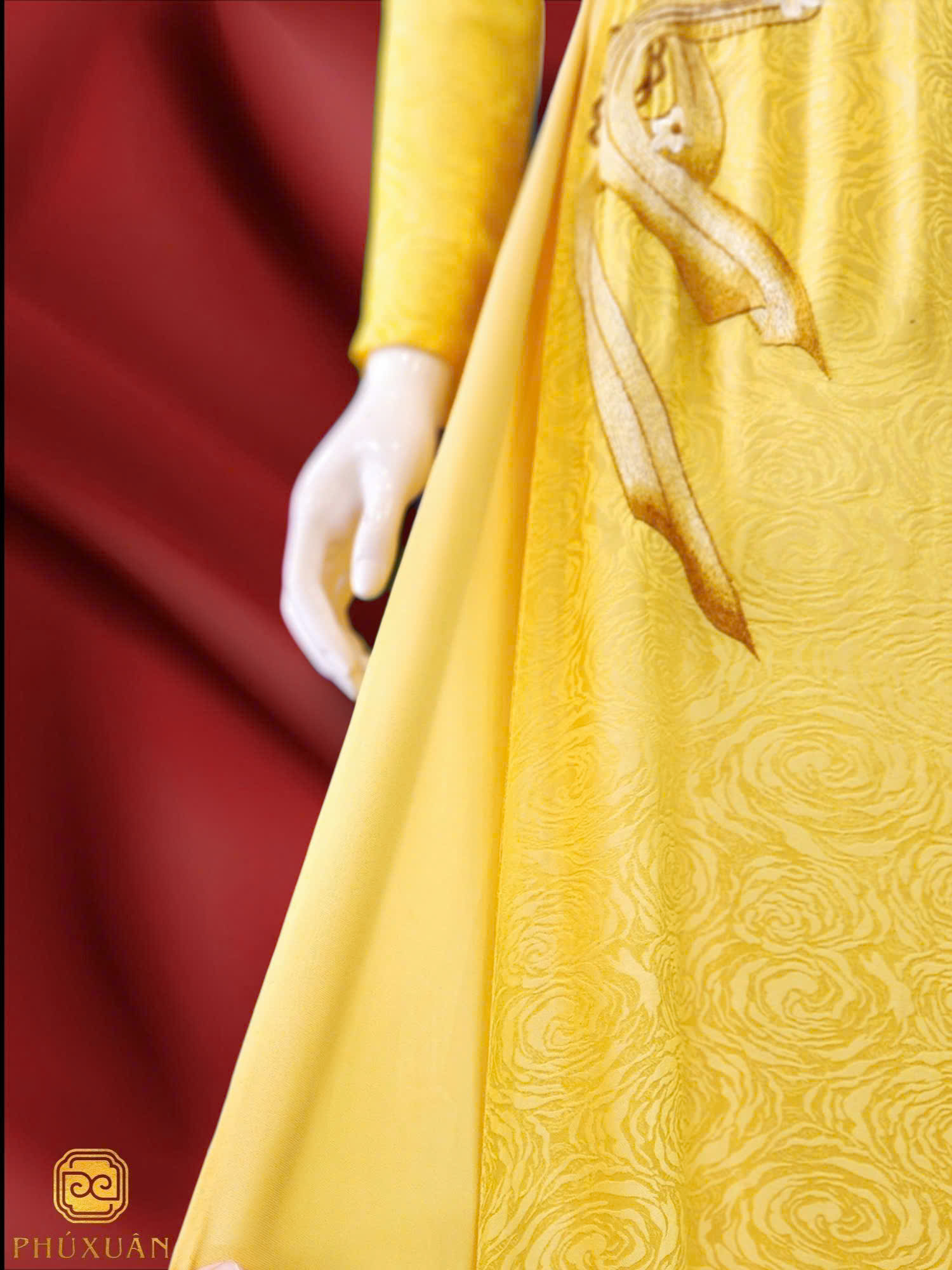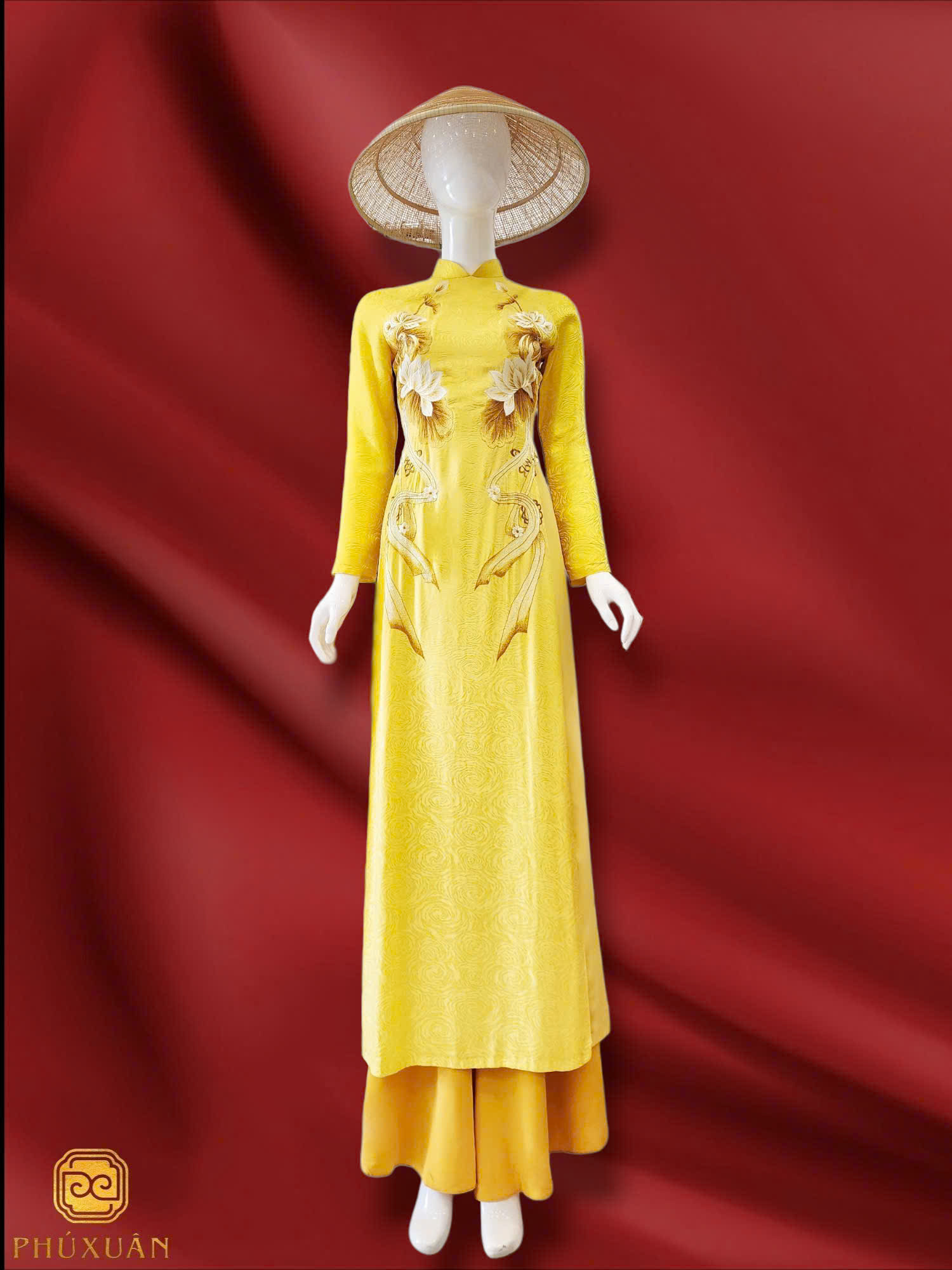 Áo dài vàng ghép hai tà với họa tiết hoa sen dọc hai bên mang đến vẻ đẹp cân đối, trang nhã và đầy chất nghệ thuật. Sự kết hợp giữa màu vàng rực rỡ và hoa sen thêu tay tỉ mỉ tôn vinh nét thanh cao, biểu tượng cho sự thuần khiết và tinh tế. Thiết kế này thích hợp cho các dịp đặc biệt, khi bạn muốn thể hiện gu thẩm mỹ sâu sắc và phong cách duyên dáng.