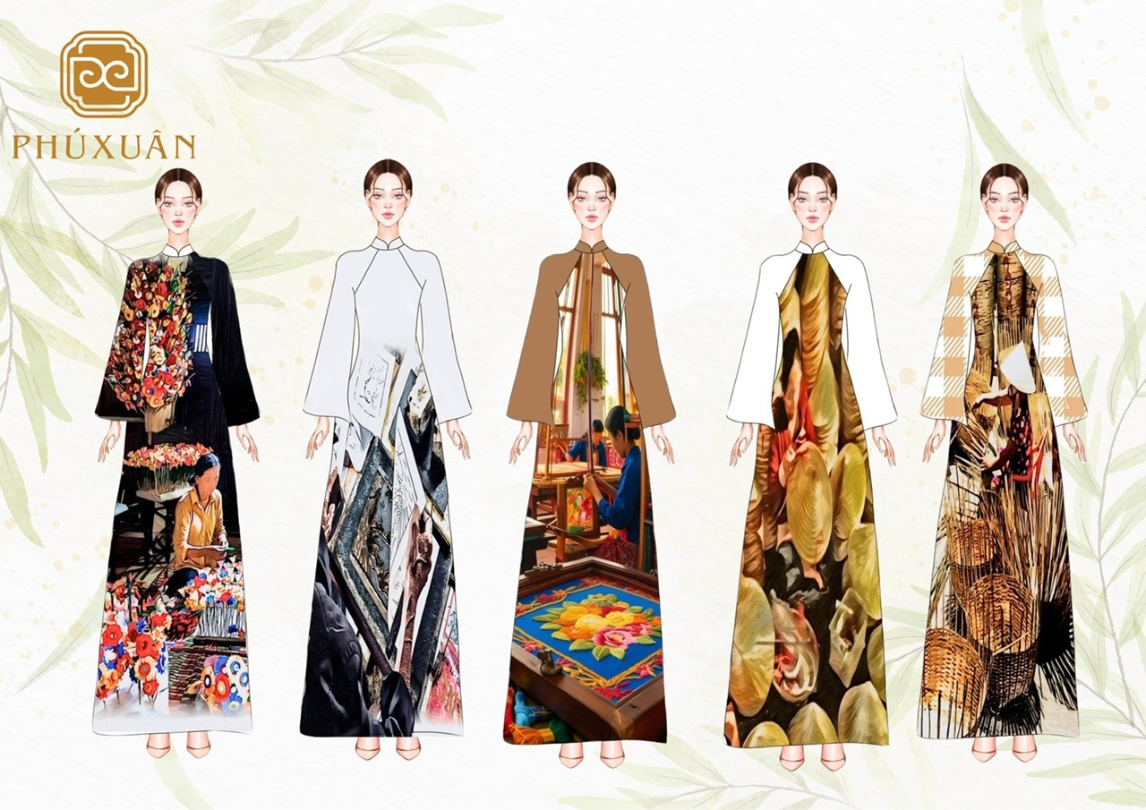 Bộ áo dài với hình ảnh in công đoạn làm hoa giấy Thanh Tiên tái hiện vẻ đẹp tinh tế của làng nghề truyền thống. Họa tiết những bàn tay tỉ mỉ xếp, nhuộm từng cánh hoa giấy rực rỡ phản ánh sự khéo léo và tâm huyết của nghệ nhân. Gam màu sống động kết hợp với hình ảnh hoa sen, hoa cúc tạo nên một thiết kế vừa mềm mại, vừa giàu giá trị văn hóa. Khoác lên mình bộ áo dài này là cách tôn vinh một nghề thủ công gắn liền với đời sống và tín ngưỡng dân tộc.