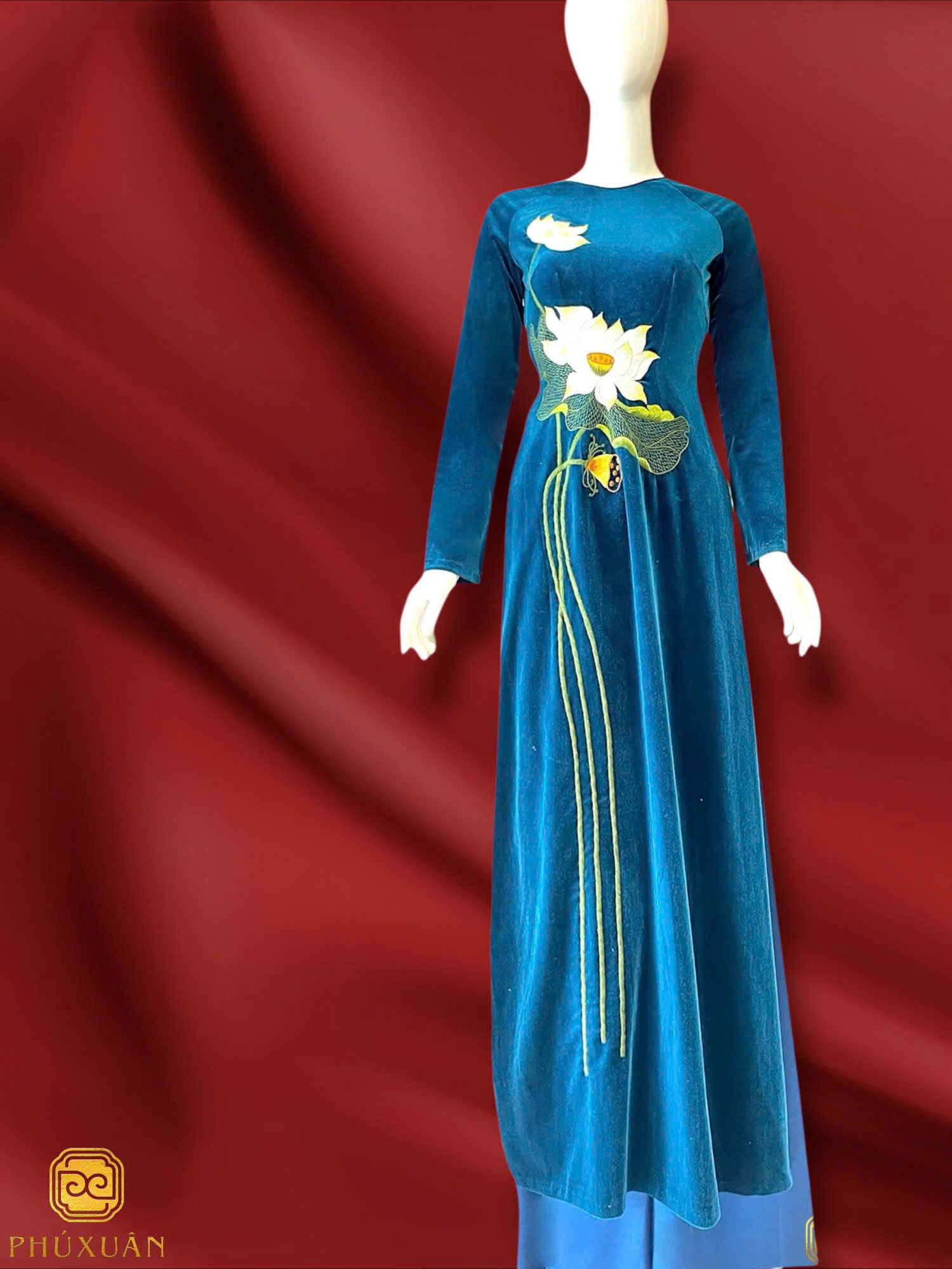 Chiếc áo dài nhung xanh hoàng gia này là hiện thân của vẻ đẹp cao quý và sâu lắng. Nét đặc biệt nằm ở họa tiết sen được thêu tinh xảo tại phần eo, nối dài uyển chuyển xuống tà áo, như dòng nước tĩnh lặng ôm trọn sắc sen trong sớm mai. Chất liệu nhung sang trọng kết hợp cùng tông xanh quyền lực, tạo nên vẻ ngoài vừa nền nã vừa cuốn hút, lý tưởng cho những dịp lễ quan trọng hay khi bạn muốn lưu giữ vẻ đẹp truyền thống trong diện mạo hiện đại.
