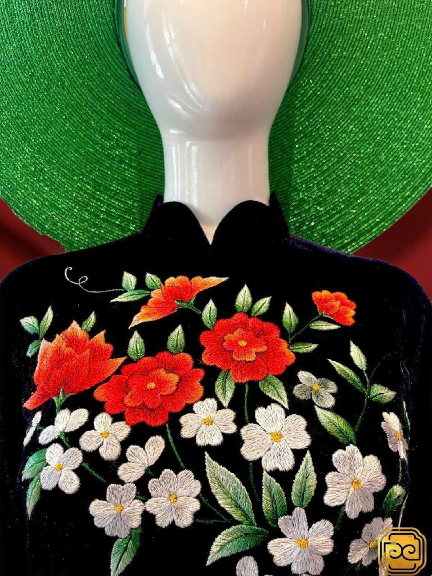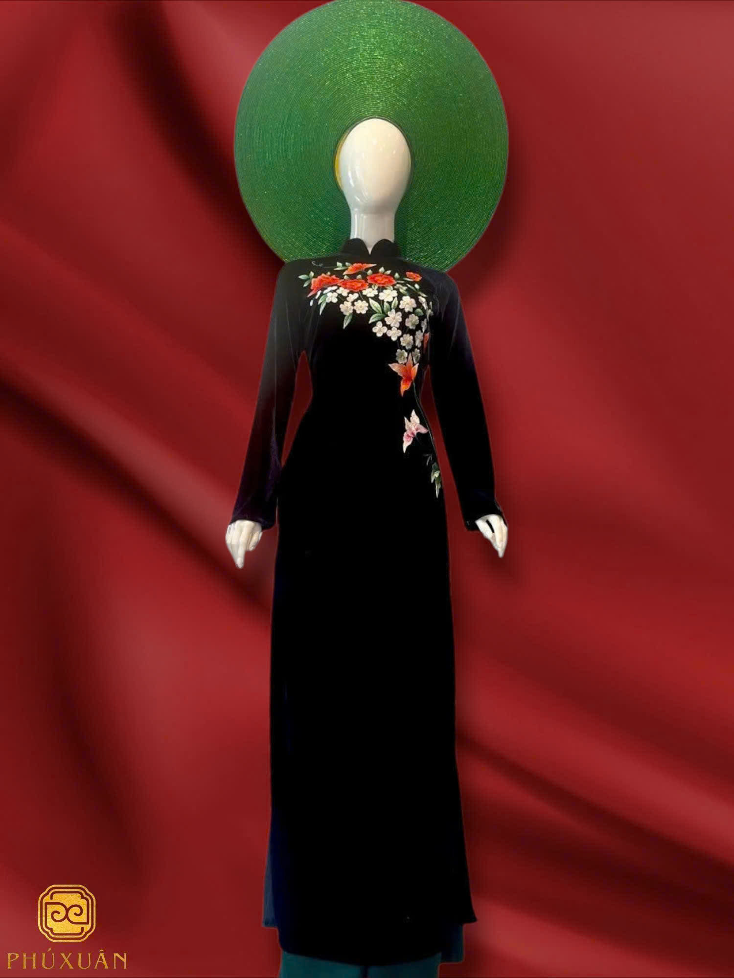 Áo dài nhung màu xanh đen thêu tay hoa nhí ở ngực là thiết kế mang vẻ đẹp cổ điển, tinh tế và đầy chiều sâu. Chất liệu nhung sang trọng tôn lên sắc xanh trầm, kết hợp với họa tiết hoa nhí thêu tay điểm xuyết ở ngực tạo điểm nhấn thanh lịch, nhẹ nhàng mà không kém phần cuốn hút. Đây là lựa chọn lý tưởng cho những dịp đặc biệt, giúp người mặc thể hiện nét duyên dáng nền nã và gu thẩm mỹ tinh tế.
