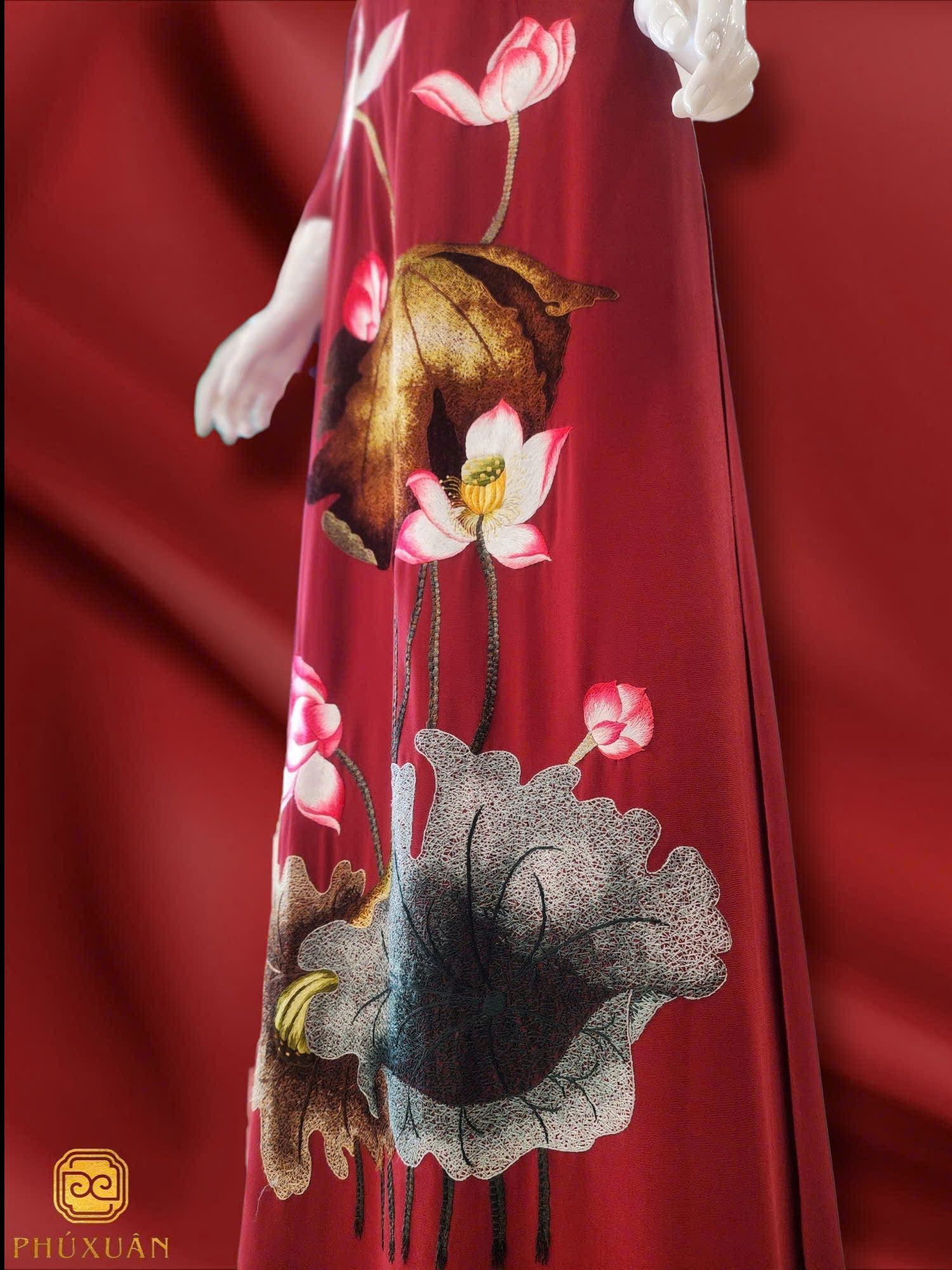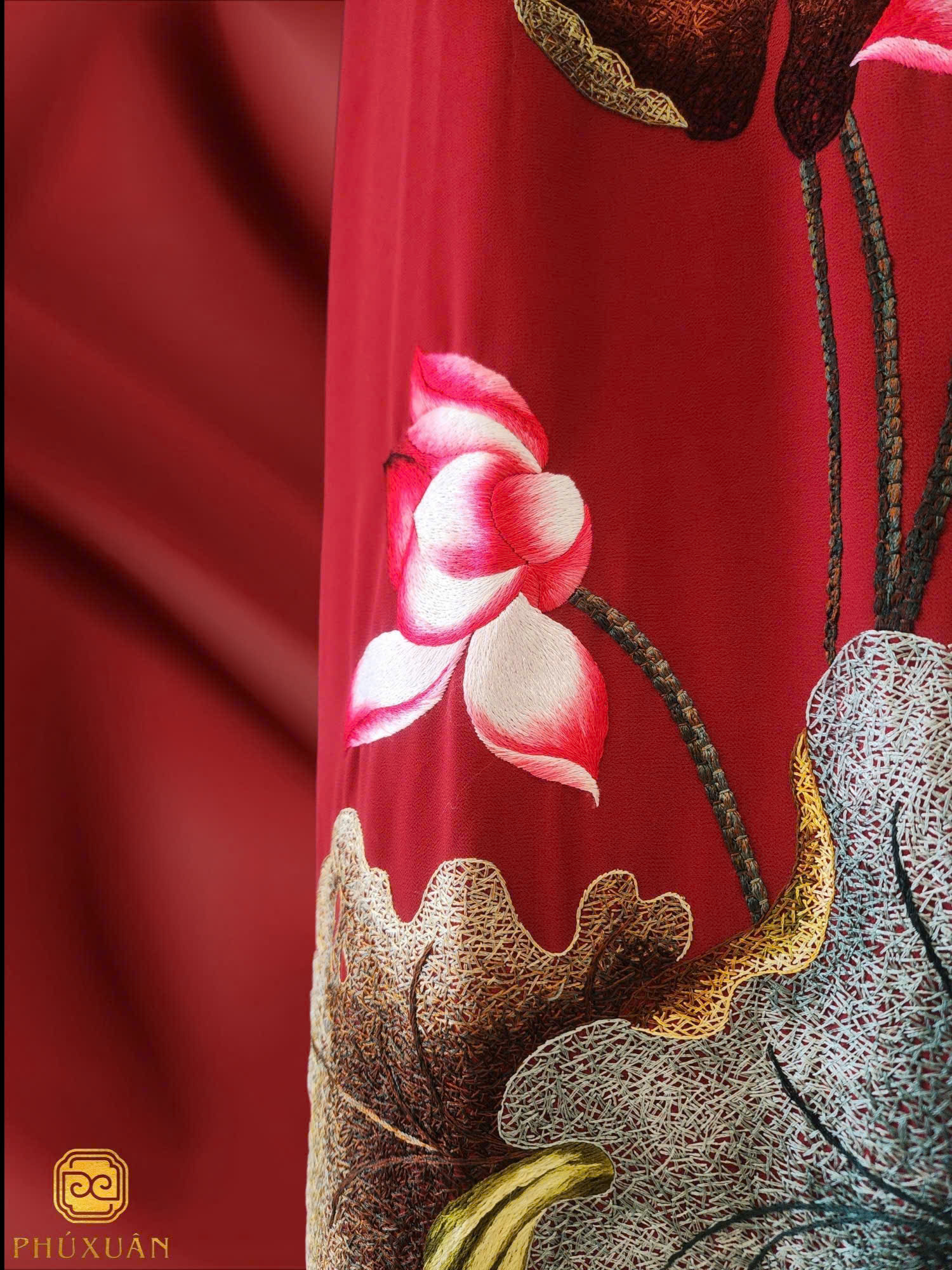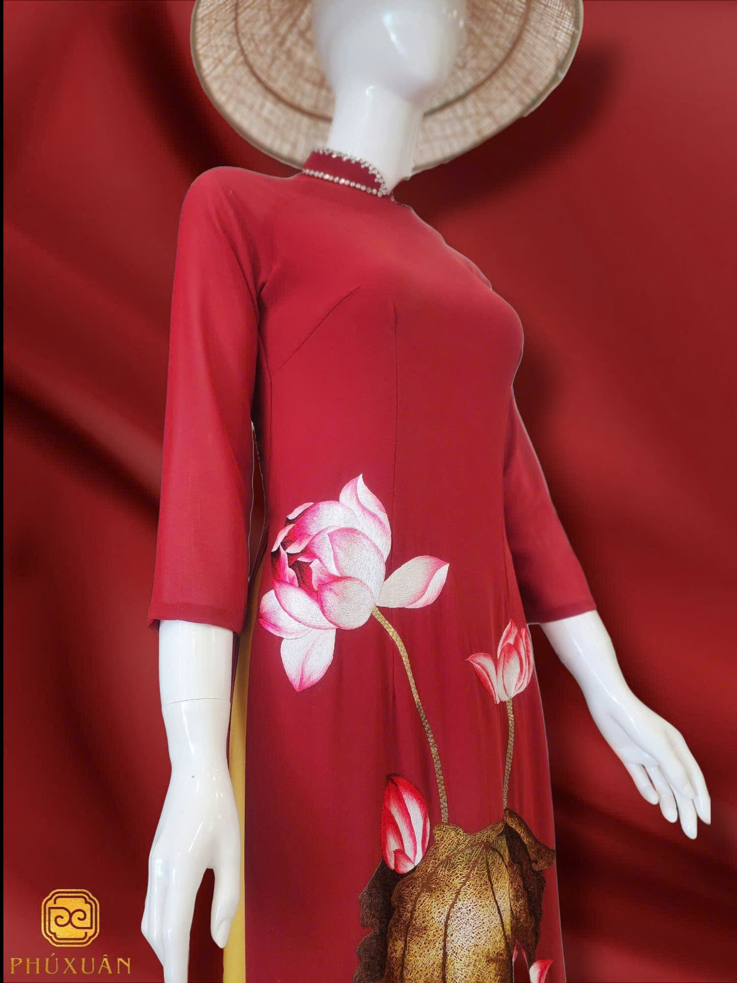 Hoa sen – biểu tượng của sự tinh khiết và phẩm chất thanh lịch – được thể hiện khéo léo trên nền sắc đỏ mạnh mẽ, tạo nên sự hài hòa giữa khí chất quyền quý và sự duyên dáng. Thiết kế này phù hợp cho các dịp lễ trang trọng hoặc sự kiện đặc biệt, khi bạn muốn tỏa sáng với nét đẹp truyền thống đầy phong cách.