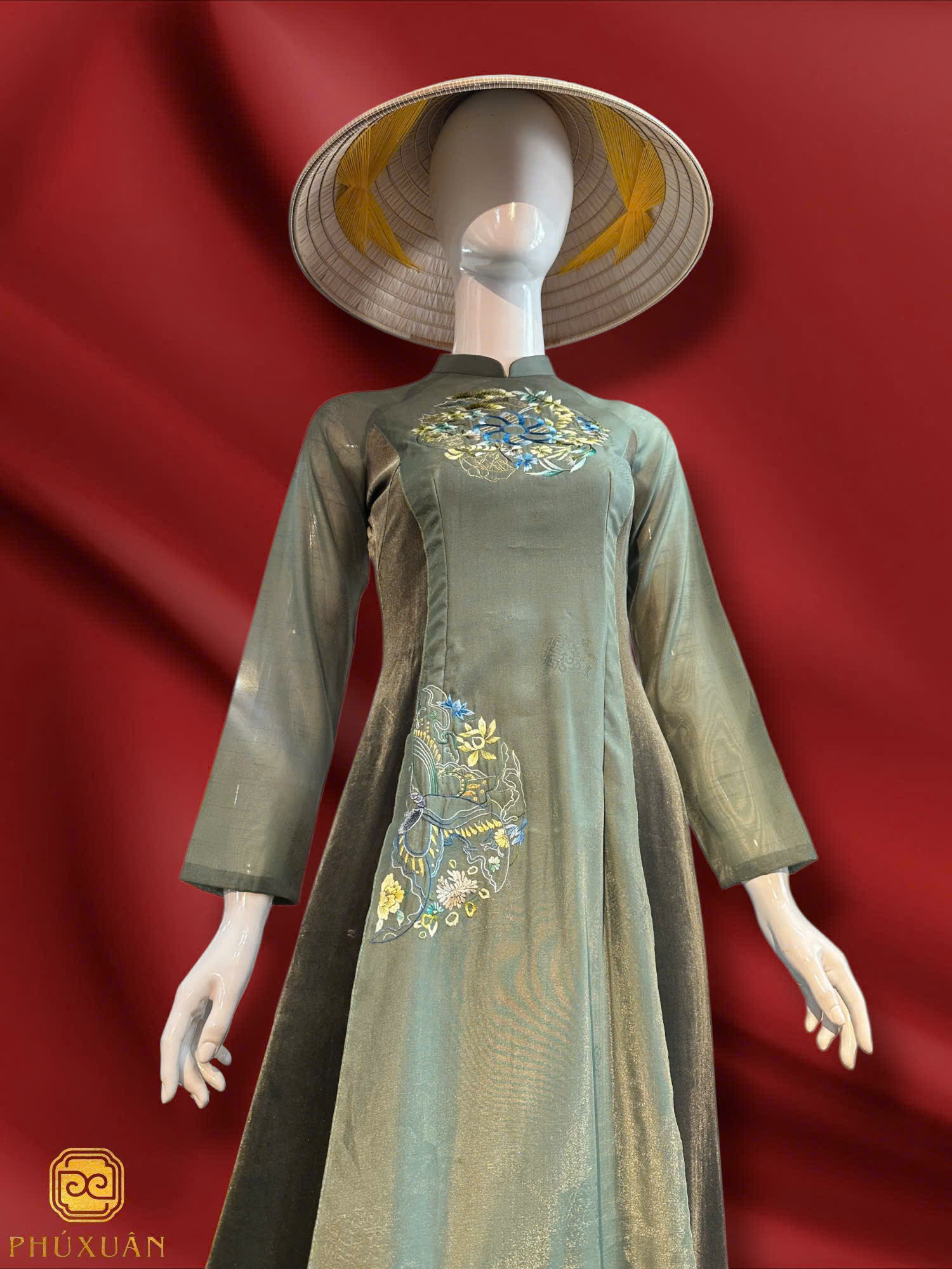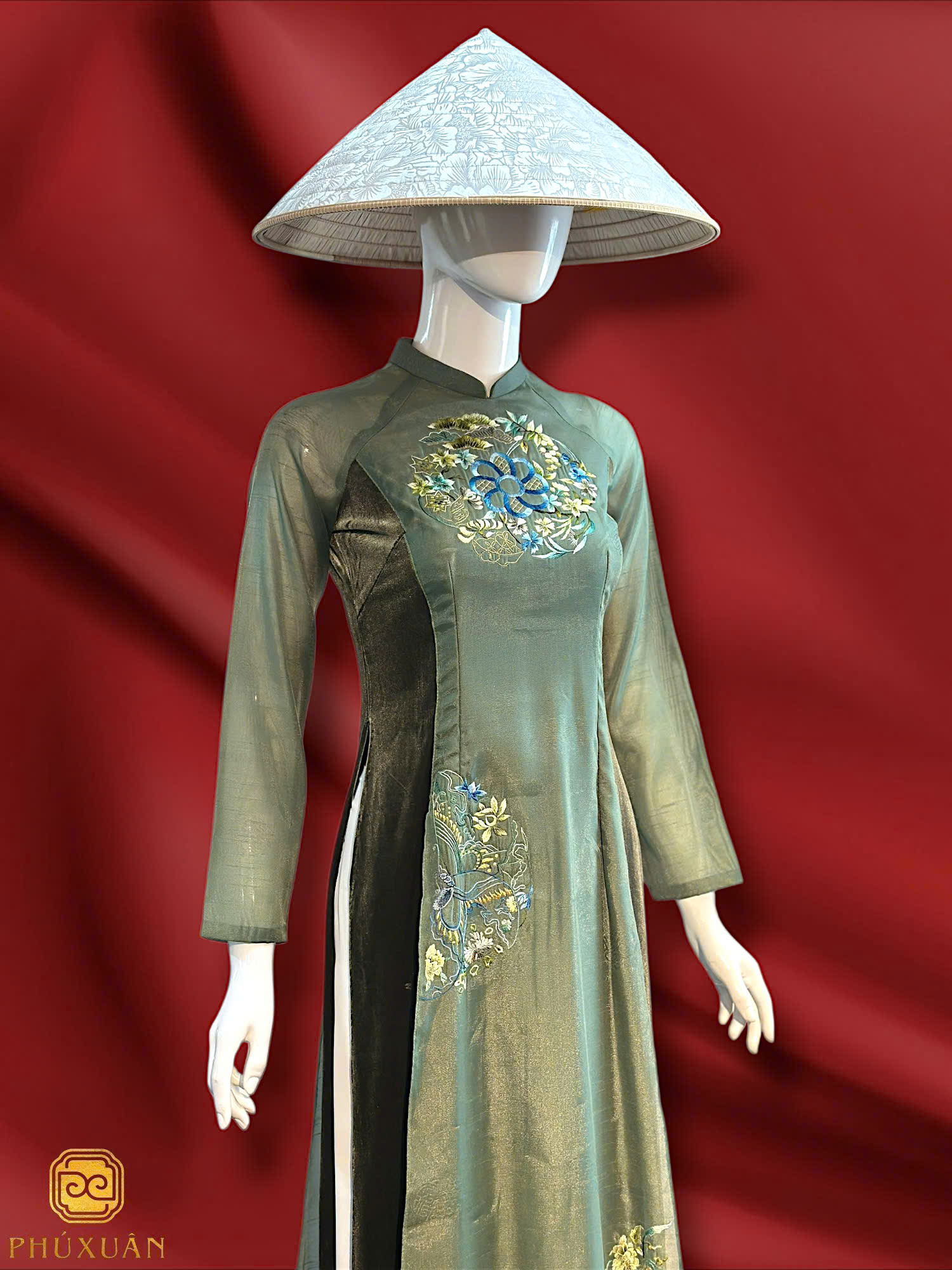 Chất liệu nhung cao cấp mang đến cảm giác ấm áp, sang trọng, trong khi chi tiết ghép tà tạo chiều sâu thị giác và nét phá cách tinh tế. Các đường thêu tay tỉ mỉ thể hiện sự khéo léo của nghệ nhân, góp phần tôn vinh vẻ đẹp thanh lịch và cá tính của người mặc.